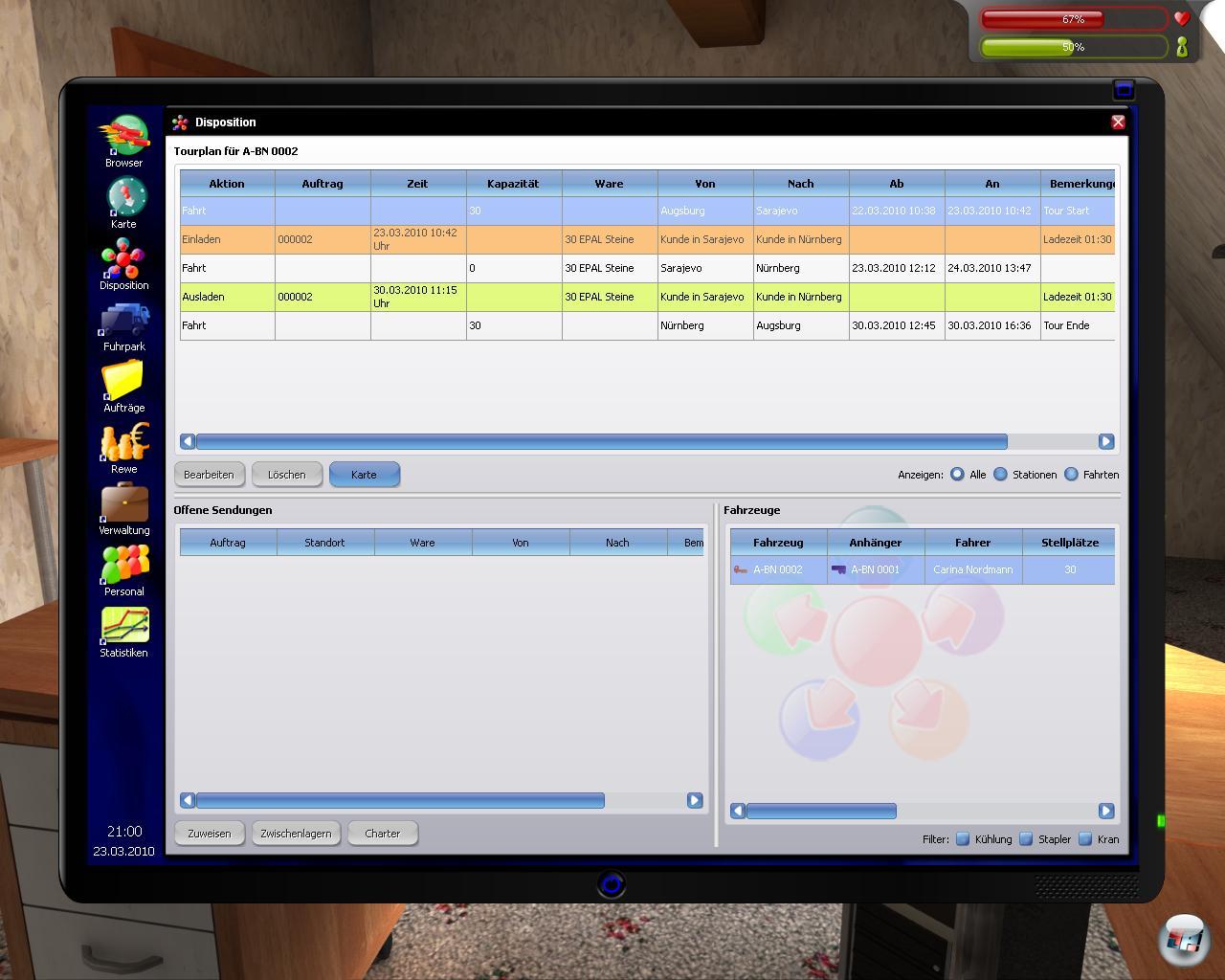 Manches wird zu unübersichtlich dargestellt – wie etwa die Aufstellung der disponierten Aufträge, die wohl nur ein echter Disponent lesen kann. So kann man die Aufträge noch nicht mal nach Datum sortieren lassen, zudem stehen wichtige Dinge versteckt. Immerhin lernt man, wie man den Fahrern ihre Fahrten zuschanzt, was in letzter Konsequenz allerdings Kollege Computer macht. Auch hier zeigen sich jedoch Unregelmäßigkeiten, denn wenn man eine Ware zwischenlagert, taucht ein Fehler auf. Man kann keine anderen Waren aufladen, denn das Zwischengelagerte befindet sich immer noch im Anhänger. Unter Zwischenlager versteht man allerdings etwas anderes…