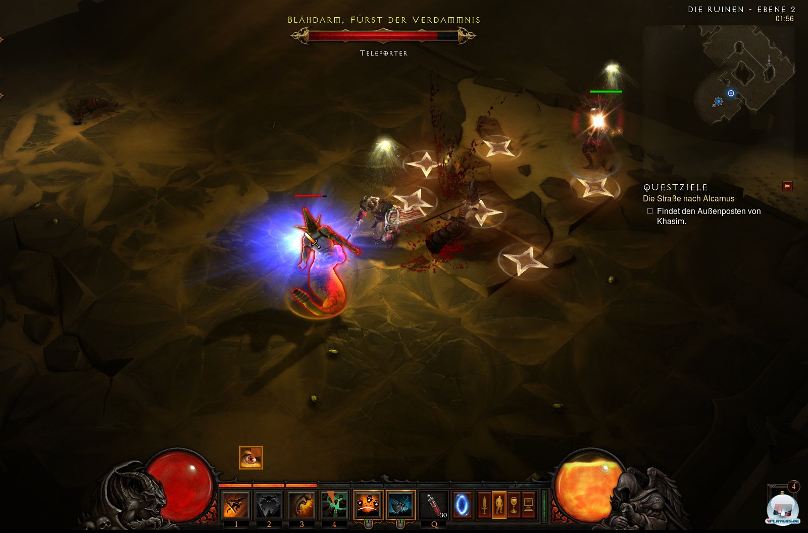 Die Effekte eingesammelter Gesundheitskugeln bekommen übrigens alle Teilnehmer zu spüren. Hat der an vorderster Front kämpfende Barbar zu wenig Leben und gerade keinen Heiltrank parat und Revanche ist nicht aktiv? Dann kann z.B. der Dämonenjäger eine Gesundheitskugel aufsammeln und damit sich und seinen Mitspieler heilen.