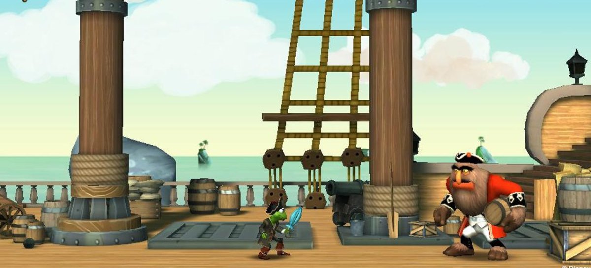 Als Kermit laufe ich z.B. lediglich von links nach rechts durch eine schrecklich monotone Piratenwelt, hüpfe ab und zu über einen Abgrund oder kloppe mit einem Regenschirm auf Gegner ein. Ab und zu wechselt der froschgrüne Held sogar wie bei Shantae: Risky’s Revenge in eine Hintergrundebene. Dort schnappt er sich meist einen Fisch, um ihn an eine aufdringliche Möve zu verfüttern. Doch selbst solche Aufgaben haben die Bezeichnung „Rätsel“ eigentlich nicht verdient. Statt Handlung oder Humor der Kinofilme einzufangen, schickt das Spiel mich einfach nur durch einige strunzlangweilige Hüpf-Levels. Ähnlich wie im alten Oscar für den Amiga bleibt dabei stets klar, dass Kermit und seine Freunde lediglich auf einem Filmset herumturnen und die Gewalt gestellt ist.