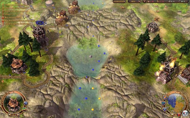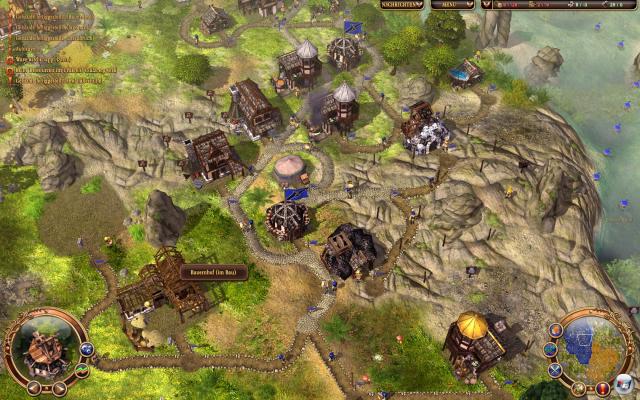 Während alle wichtigen Buttons an der Minikarte bzw. dem Beobachtungsfenster untergebracht wurden – ein Online-Rollenspiel mit Interface-Mod-Funktionalität diente wohl als Vorlage – lassen sich die Transport- und Einlagerungs-Prioritäten einfacher Verwalten als beim Vorgänger bzw. dem Remake, vor allem wenn man mehrere Lagerhäuser in der Siedlung hat. Nicht missen möchte ich die Nachricht „Warenstau an einer Fahne“, die explizit aufzeigt, wo es gerade im Transportkreislauf hakt. Etwas umständlich, aber funktional ist der Gebäudebau: Ihr lasst euch die verfügbaren Bauplätze anzeigen, klickt auf den gewünschten Standort und wählt mit Hilfe eines Kontextmenüs das Gebäude aus – ein Klick