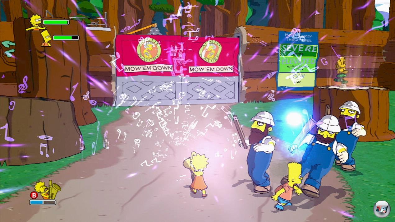 Spielverlauf unentbehrlich machen: Bart kann sich in Bartman und Robo-Bart verwandeln sowie mit seiner Steinschleuder um sich schießen. Homer wird auf Knopfdruck zum adipösen Homer-Ball, mit dem er alles plattwalzen kann – falls das nicht reicht, erledigt ein Mega-Rülpser den Rest. Die gute Seele Lisa nutzt die göttliche Hand von Buddha, um Gegenstände zu verschieben oder ihr magisches Saxophon, um dafür zu sorgen, dass Gegner aufeinander losgehen – außerdem kann sie sich in das durchschlagskräftige Clobber Girl verwandeln. Marge schließlich ist schwach, kann aber mit ihrem Megaphon Menschenmassen auf ihre Seite ziehen, die dann die Drecksarbeit für sie erledigen. Diese Fähigkeiten müssen sinnvoll kombiniert werden, um in den Levels weiterzukommen, wobei ihr in Springfield jederzeit die Protagonisten an Bushaltestellen wechseln könnt. Innerhalb der eigentlichen Spielabschnitte sind die Helden vorgegeben.