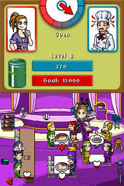 Kaum öffnet euer erstes eigenes American Diner seine Pforten, beginnt auch schon die Hektik. Mehrere Gäste strömen in den Laden und warten darauf, dass ihr ihnen einen Platz zuweist. Bei der DS-Version tippt ihr dazu auf ein Grüppchen in der Warteschlange und zieht es zu einem Tisch. Nach ein paar Sekunden Speisekartenlektüre nehmt ihr die Bestellung auf und bringt sie zu einem kleinen Karussell, woraufhin der Koch anfängt zu schnippeln und zu brutzeln. Noch ein Weilchen später serviert ihr das Gericht, und wenn die Gäste satt sind, kassiert ihr und räumt das Geschirr weg. In den kleinen Pausen kümmert ihr euch um die übrigen Gäste. Klingt kinderleicht, nicht wahr? Ist es auch, denn auf Nintendos Handheld tippt ihr z.B. einfach auf das fertige Gericht, dann auf den jeweiligen Tisch und schon wetzt die Bedienung los und bringt die kulinarische Köstlichkeit zum richtigen Gast. Die übrigen Aktionen löst ihr ebenfalls durch einfaches Antippen aus. All das funktioniert sogar intuitiver als die Mausbedienung bei der PC-Version.