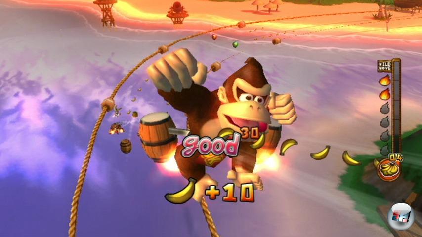 Oder vielmehr würde, denn die Entwicklung wurde im letzten Röcheln des GameCubes gestoppt und auf die Wii-Schiene umgeleitet. Resultat: Ihr macht genau die gleichen Aktionen, nur ohne Bongos. Dass die Affen weiterhin die Dschungel-Perkussion am Gürtel tragen, kann man als mittelschweren Stilbruch durchgehen lassen – Nunchuk-Umschnallraketen sind einfach nicht dschungeltauglich.![]()