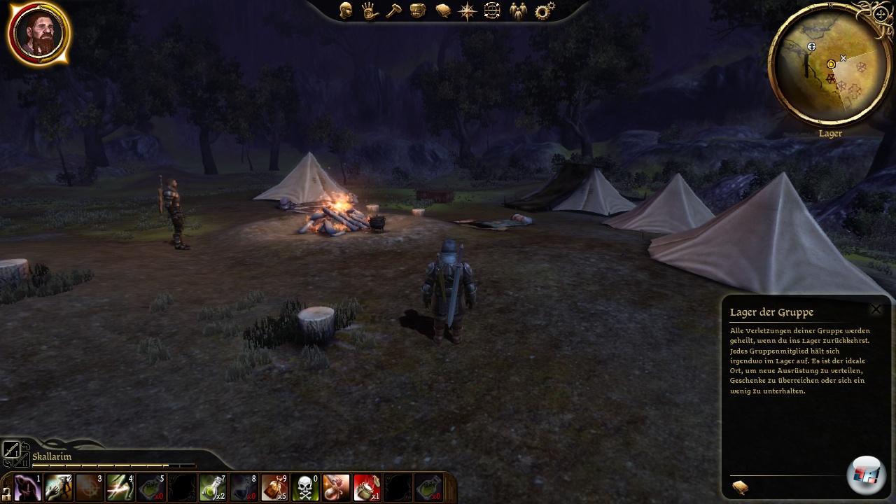 Hinzu kommen ja die dynamischen Beziehung zwischen den Gefährten und dem Helden, die man im Lager pflegen kann. Das ist ein enormer Motivationsfaktor, der mich für Stunden beschäftigt hat, weil es hier um Rollenspiel im besten Sinne geht. Man kann Rast machen und sich auf einem Zeltplatz mit Feuerstelle frei zwischen seinen Gefährten, Besuchern und Händlern bewegen. Hier liegt quasi der Ruhepol, um abseits der Kämpfe abzuschalten und zu kommunizieren. Da jeder Charakter eine ausgearbeitete Hintergrundgeschichte hat, lohnt sich der Lagerfeuertalk.