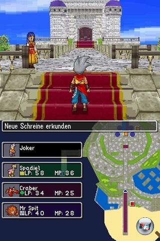 Ein Grund dafür ist die coole Kulisse, die mich von der ersten Szene an gefangen nimmt. Komplett dreidimensional, mit Figuren, die wie in DragonQuest 8 auf der PS2 eine leichte „Comic-Umrandung“ besitzen, stelle ich immer wieder verwundert fest, dass der DS nach wie vor zu Überraschungen fähig ist – wenn man weiß, wie man ihn richtig ausnutzt. Und Square Enix scheint ein Meister des DS zu sein. Abgesehen von den im Detail teils unschön aufpixelnden Texturen und den zu häufig eingesetzten Klon-NPCs erinnert mich die Kulisse tatsächlich eher an einen frühen PS2-Titel als an ein DS-Spiel.