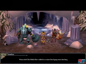 Die standesgemäße Inszenierung von Dragonshard überzeugt und erinnert teilweise sogar an die Herr der Ringe-Filme. Insbesondere bei der heroischen Musik und dem beeindruckenden Intro ist das der Fall, die ganz schön aufpeitschen. Auch die Geräuschkulisse klingt wuchtig, was ebenfalls zur Motivation beiträgt. Die Kulisse bietet bis auf die eindrücklichen Effekte eher Solides denn wirklich Berauschendes. Insbesondere aus der Nahansicht wirken die Texturen der Einheiten und Helden irgendwie wenig plastisch und fast zinnfigurenartig. Auch die 3D-Umgebung könnte noch abwechslungsreicher sein. Die Umwelt ist auch nicht durchweg begehbar, wofür nervige Blockaden verantwortlich sind. Wuchtig wieder die Aufmachung der Menüs und Bedienfunktionen mit vielen mechanischen Elementen, was an Dungeon Siege erinnert. Die Maschinen poltern und rattern auch, wie es sich gehört. Leider ist die deutsche Sprachausgabe alles andere als ein Wucht, da sie sich reichlich unprofessionell anhört: Die Stimmen sind viel zu leise und klingen hohl. Die Sprachausgabe ist auch nur in den Zwischensequenzen in Spielgrafik zu hören, sonst müsst ihr die oft langen Dialoge nachlesen.