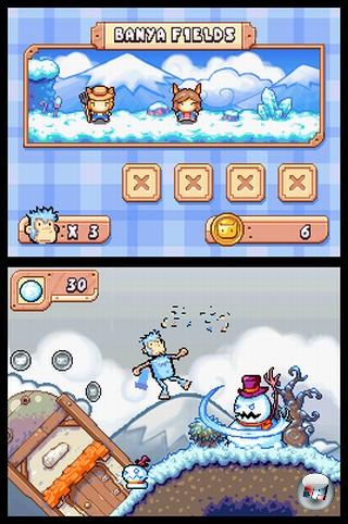 – einfach designte Levels, fair verteilte Gegner, simple Hüpfeinlagen. Die Lernkurve ist sehr flach, dafür ist der Umfang bemerkenswert – euch erwarten 15 lange Levels, die in mehrere Abschnitte unterteilt sind, und euch ungefähr acht Stunden beschäftigt halten sollten. Einen Teil zu dieser für ein Jump-n-Run verhältnismäßig langen Spielzeit trägt das missratene Speichersystem bei: Frei den Spielstand sichern ist nicht möglich, es wird grundsätzlich nur im Dorf gespeichert, von dem aus ihr zu den einzelnen Missionen aufbrecht – seid ihr also mitten im dritten Abschnitt eines langen Levels, müsst ihr bis zum bitteren Ende spielen oder den DS zuklappen, wenn ihr unterbrechen, aber nächstes Mal nicht wieder von vorn anfangen wollt. Immerhin gibt es dazu einen putzigen Soundeffekt, der sich harmonisch zum Rest der Akustik gesellt: Fröhliche Klimperklänge begleiten den Spieler gut gelaunt durch die Welten.