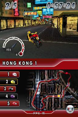 Loch Lomund über Marrakesch bis hin zu Hong Kong erstrecken, müssen in der Meisterschaft freigespielt werden. Im Prinzip kein ungewöhnlicher Weg, doch in diesem Fall ist der Karrieremodus eine dermaßen zähe Angelegenheit, dass man schnell die Lust am Rasen verliert. Warum? Weil man gerade am Anfang immer wieder über die gleiche Piste in der gleichen Kulisse gurken muss, an der man sich eigentlich schon nach dem ersten Rennen satt gesehen hat. Denn die Meisterschaft ist folgendermaßen aufgebaut: Neben einem Standardrennen gegen bis zu vier Fahrer hat man die Wahl zwischen den Spielmodi Zeitfahren (gegen die Uhr), Eliminierung (der Letzte pro Runde scheidet aus) und Ideallinie (Münzen einsammeln). Während bei Letzterem lediglich eine Strecke vorgegeben wird, müsst ihr in den anderen Modi jeweils einzeln die drei Pisten freischalten, bei denen es sich jedoch nur um verschiedene Variationen handelt. Entsprechend eintönig geht es zur Sache, wenn ihr den gleichen oder ähnlichen Rundkurs wieder und wieder fahren müsst. Doch genau das ist nötig, wenn man die Erlaubnis erhalten will, auch in anderen Städten und Ländern an den Start zu gehen. Mindestens 20 Punkte müssen erspielt werden, um weitere Szenarien freizuschalten. Da aber pro Event maximal drei Punkte für einen Sieg drin sind, kann man sich gut vorstellen, dass es einige Zeit dauert, bis es weiter geht. Keine Belohnung gibt es für die Stunt-Events, die erst dann für ein Gebiet freigeschaltet werden, wenn man zuvor alle anderen Modi in Angriff genommen hat. Hier warten mit Weitsprüngen, Wheelie und Burnout drei Minispiele für zwischendurch, die aber mangels Anspruch und Motivation schnell wieder vergessen werden.![]()