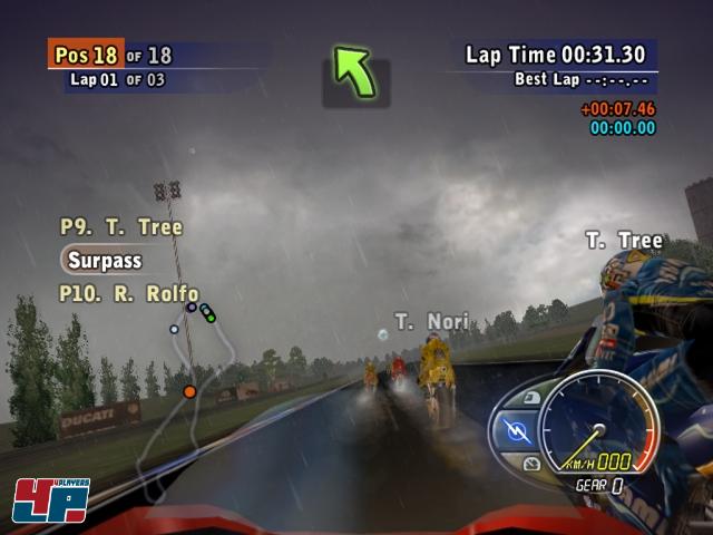 Mal abgesehen davon, dass die Kulissen bis auf den gelungenen Schatten mit ihren matschigen Texturen durchweg grob und unspektakulär daher kommen, die Animationen vor allem in den Replays alles andere als geschmeidig sind und es nicht einmal eine ordentliche Cockpit-Ansicht samt überzeugendem Geschwindigkeitsgefühl gibt, ist der Titel vor allem spielerisch eine peinliche Fehlzündung. Zwar dürft ihr in den Menüs den Simulationsgrad regeln, doch hat dies auf die lächerliche Fahrphysik keinerlei Einfluss: Die Ducati-Bikes steuern sich immer wie auf Schienen – selbst wenn es neben die Strecke aufs Gras geht. Grip ist seltsamerweise immer vorhanden. Egal, ob ihr mit Vollgas aus den Kurven heraus beschleunigt oder auf nassem Asphalt hart in die Eisen geht, bleiben die leicht eckigen Reifen problemlos in der Spur. Auch die Kollisionsabfrage ist erbärmlich: So rast ihr mit über 300 Sachen in einen Fahrerpulk hinein, ohne dass etwas passiert und jemand stürzt. Es kommt euch so vor, als würdet ihr in zweirädrigen Autoscootern sitzen, so wie die Maschinen bei Berührungen voneinander abprallen. Streift ihr dagegen nur kurz eine Seitenbande, werdet ihr selbst bei deutlich niedrigerem Tempo sofort von eurer Maschine geschleudert. Hier bestimmt jedoch der eingestellte Simulationsgrad, wie schnell euch Kollisionen von der Maschine hauen – allerdings nur bei der Seitenbegrenzung, denn bei Kollisionen zwischen Fahrern geht es auch in der Simulation meist ohne einen bösen Crash weiter. Ein echtes Schadensmodell mit Beulen und Leistungseinbußen gibt es nicht, doch nimmt die Lebensenergie eures Fahrers und der Maschine nach jedem Sturz und Kollisionen ab. Ist die Anzeige bei Null, müsst ihr das Rennen aufgeben. Das ist besonders dann ärgerlich, wenn euch in Zweikämpfen ständig die CPU-Fahrer streifen und ihr für deren Fehlverhalten bestraft werdet. Einen leichten Arcade-Touch findet ihr im BPShock, mit dem ihr zuvor gesammelte Stilpunkte für kurzzeitige Geschwindigkeits-Boosts verwendet.