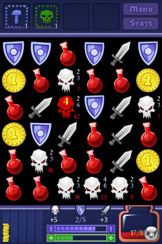 Der Spieler hat vier Steinarten auf seiner Seite: Schwerter, Schilde, Heiltränke, Goldstücke. Letztere schaufeln logischerweise Geld aufs Konto, für das man, sobald eine bestimmte Grenze erreicht ist, ein Item kaufen darf. Tränke heilen den Spieler; Schilde reparieren in erster Linie die Rüstung, haben aber noch einen Zusatzeffekt: Ist die Rüstung schon auf voller Stärke, fallen die Schildpunkte dem Upgrade-Kontingent zu – und ist das gefüllt, darf man unter zwei Bonus-Items wählen. Von denen gibt es mehr als 400, die per Zufall ausgewählt werden: Neue Waffen und Rüstungsteile, mehr Lebensenergie oder bessere Verteidigungswerte, Umwandler (mit denen man z.B. Schwerter in Münzen verwandeln kann) oder Einsammler, die auf Knopfdruck alle Steine einer Sorte einsacken. Manche Items wirken sich direkt auf den Spieler aus (wie mehr Lebensenergie), manche werden nur bei Bedarf aktiviert. Von denen darf man gleichzeitig maximal vier haben, außerdem benötigen sie nach ihrer Anwendung eine gewisse »Cooldown«-Zeit, die mehrere Runden dauert. Was uns zum wichtigsten Spielstein bringt: Dem Schwert.