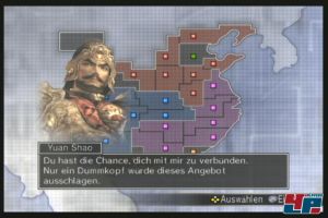 Als Nächstes entscheidet ihr, ob ihr in eine fremde Region einfallen, einen gegnerischen Angriff abwehren oder überhaupt nichts tun wollt. Von Letzterem gehen wir jetzt mal nicht aus, denn sonst könntet ihr ja auch Dynasty Tactics spielen. Kommt es zu einem Aufeinandertreffen zweier Kriegsparteien präsentiert sich Empires nämlich durch und durch als Dynasty Warriors-typisches Actionfest. Da heißt ihr dirigiert nicht irgendwelche Truppen taktisch gewieft aus sicherer Entfernung über das Schlachtfeld, sondern ihr greift selbst zur Waffe und stürzt euch ohne Umschweife mitten ins Getümmel.