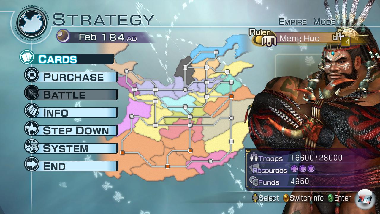 Und Koei wäre nicht Koei, wenn man nicht den Prinzipien nahezu stur treu bleiben würde. Sprich: Auf dem Schlachtfeld spielt sich der Empires-Modus wie immer. Zwar gibt es ein paar interessante Missions-Varianten wie Eskorten oder Dorfbewohner, die vor wilden Tieren gerettet werden müssen, die im Übrigen sehr staksig animiert sind. Doch die wesentliche Änderung liegt im leicht an Risiko erinnernden Taktik-Karten-Modus, der zwischen den Schlachten auf einen wartet und in dem man abhängig von der gewählten Figur diverse Auswahlmöglichkeiten hat.