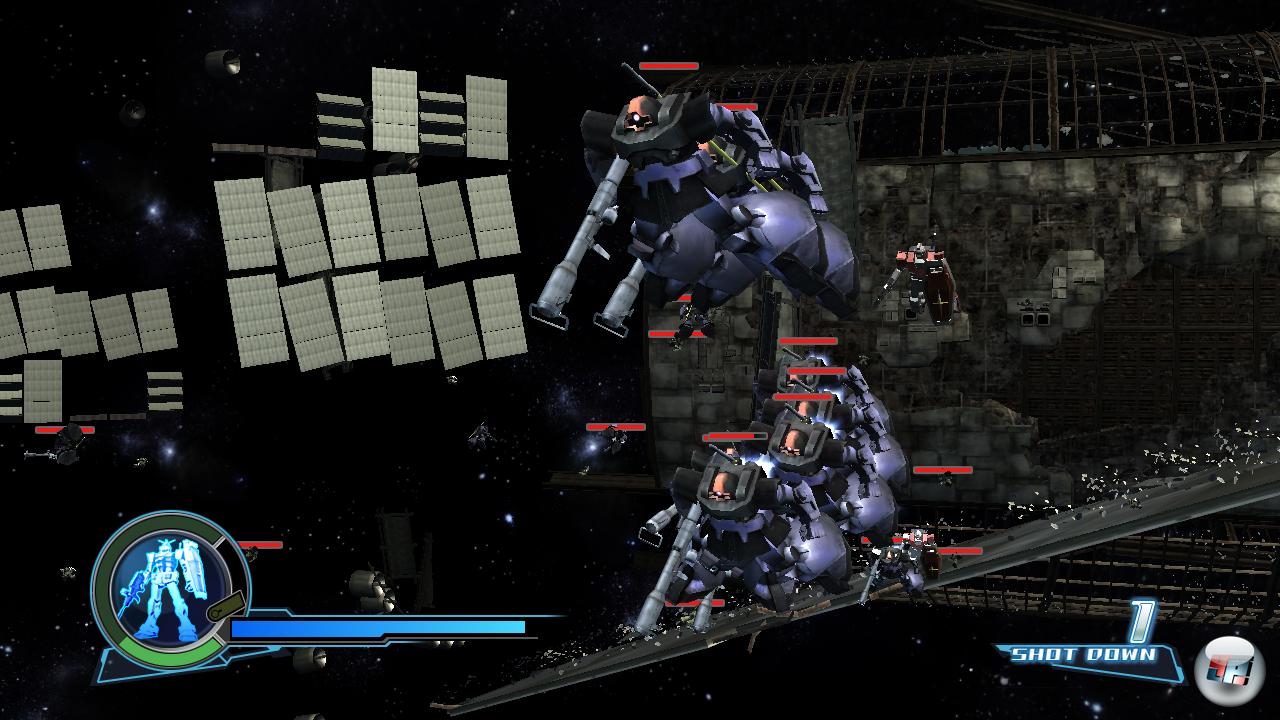 Anit-Falten-Creme hat auch nötig, wer einen genauen Blick in seine Umgebung wirft: Ist das im Zeitalter von Oblivion oder N3 wirklich alles, was es zu sehen gibt? Roboter, Gebäude und Gebirge stehen mit ihren gerade ausreichend detailreichen Oberflächen in größtenteils nackten Kulissen – in denen die zahlreichen Mechs selbst beim Drüberwalzen so wenig kaputt machen, dass sich die Leute bei Havok wahrscheinlich fragen, warum sie in den letzten Jahren überhaupt zur Arbeit erschienen sind. Macht nichts, wirkt aber antik. Im Gegenzug dazu bietet DW: Gundam immerhin viele unterschiedliche Schauplätze und schießt Dynasty Warriors sogar erstmals in den Weltraum. Schließlich finden etliche Gefechte zwischen Raumkreuzern und -stationen statt, wenn auch auf nur einer horizontalen Ebene. Um das Kombo-Kämpfen in die dritte Dimension zu heben, hätte Omega Force neue Spielelemente vorstellen müssen – weil sie daran aber freilich im Traum nicht denken, hätten sie den Schritt ins All vielleicht besser bleiben lassen, denn so wirkt der Ausflug in die Schwerelosigkeit zumindest optisch albern.