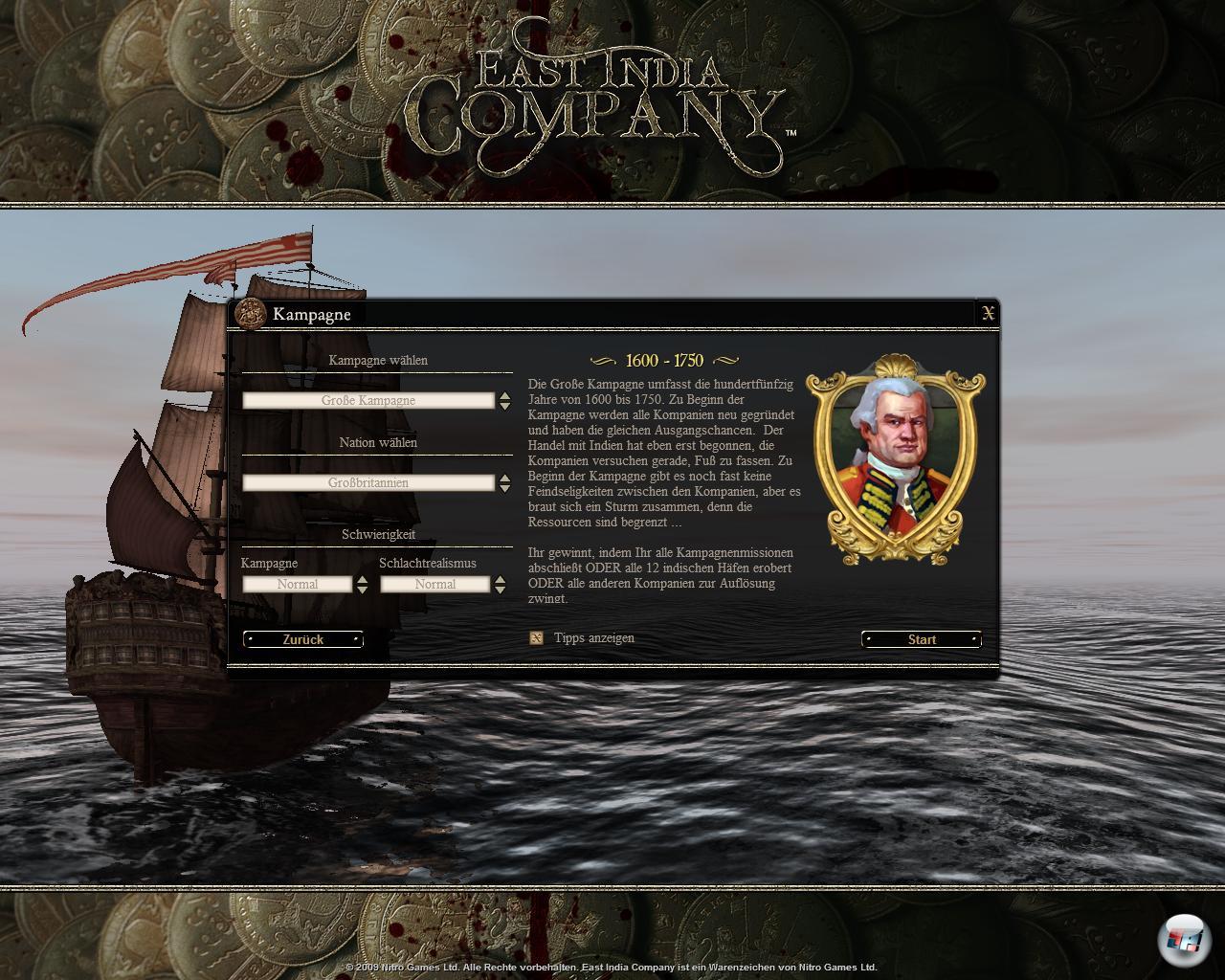 Portugal und Deutschland spielen. Die Nationen sind anfangs gleich stark, so dass es keinen großen Unterschied macht, wen man nimmt. Immerhin haben die Schiffe der englischen Ostindienkompanie die richtige Flagge gehisst, die ein wenig anders aussieht als die Flagge des Königs. Doch bei den Deutschen, die es als Staat zum Spielstart 1600 noch gar nicht gab, hat man sich weniger Mühe gegeben, denn sie hissen den Doppeladler des Kaiserreichs Österreich – schade. Man hätte sie gleich Österreich nennen oder ihnen stattdessen die preußische Fahne geben können, da es beide Kompanien gab. Aber so ist es nichts Halbes und nichts Ganzes, das allein den Vorteil hat, dass man Deutschland spielen kann.