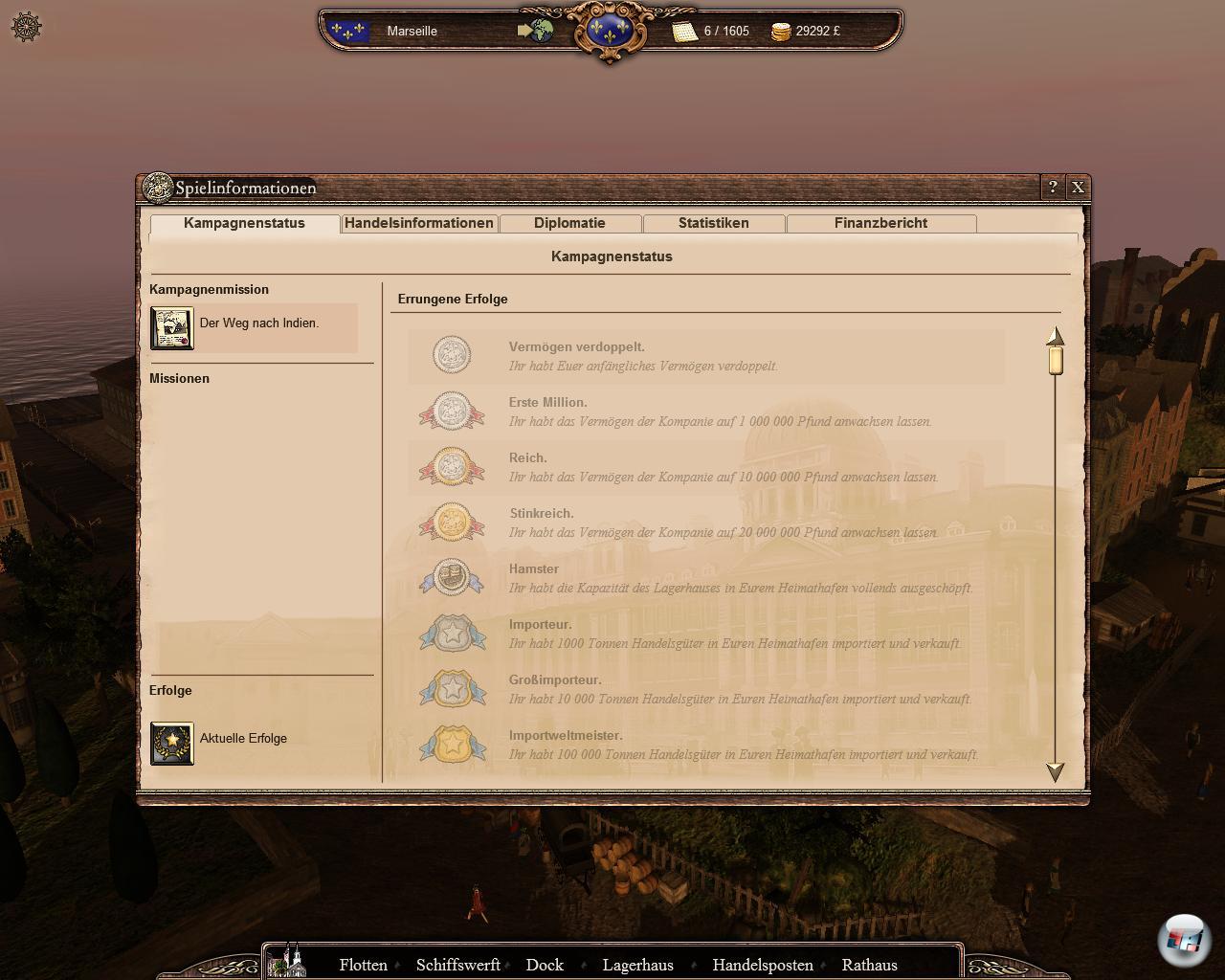 Der Beginn erinnert an Spiele wie Patrizier, auch wenn alles einfacher fällt. Man startet mit einer eigenen Niederlassung im Heimathafen, hat nur ein Schiff und muss Geld scheffeln. Obwohl man keine große Ahnung hat, wie das laufen soll, bekommt man laufend Tipps, was man machen muss. Sonst ist „learning by doing“ angesagt, so dass man die Anleitung nicht unbedingt lesen muss. Zudem ist in der Kampagne das Gerüst vorgegeben, wo man innerhalb weniger Jahre Aufgaben erledigen muss. Einen Hafen erobern, eine Flotte ausrüsten oder eine bestimmte Menge einer Ware ranschippern. Wenn man sich nicht verzettelt, ist das auf Schwierigkeitsstufe „normal“ leicht zu schaffen. Am Anfang sollte man so wenig wie möglich Geld ausgeben, da auch laufende Kosten zu bestreiten sind. Wenn man die Garnison einer Niederlassung vergrößert, steigen auch die jährlichen Ausgaben.