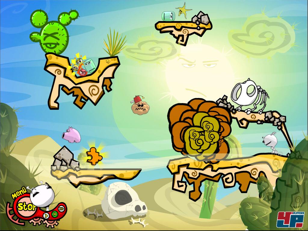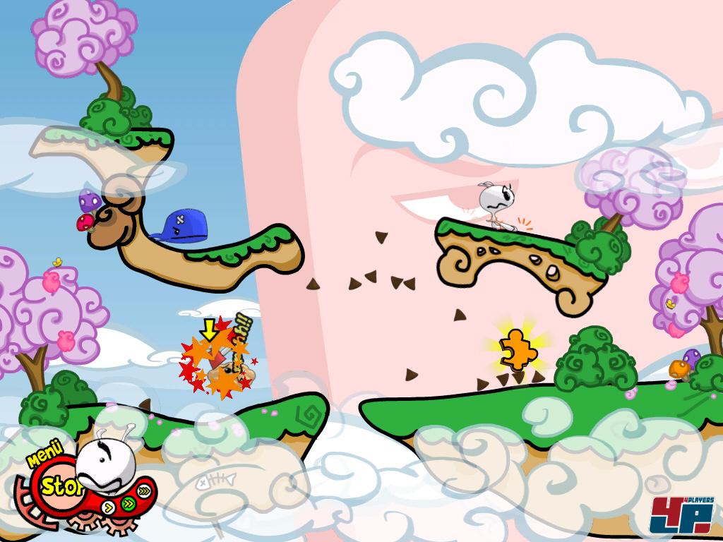 Das macht er 120 Levels lang, allerdings ist er nicht allein: Knapp zwei Dutzend Items stehen ihm mit Tat zur Seite. Die wichtigsten davon sind die kleinen Marshmeellows, die ihm bei Verzehr entweder Angst, Freude oder Wut bereiten – und er daraufhin bedächtig, fröhlich oder forsch vorgeht. Zusätzlich zu diesen Grundstimmungen verfügt ihr u.a. noch über folgende Hilfsmittel: Einen Wal, der Eets verschluckt und über eine weite Distanz wieder ausspuckt, ein niesendes Schwein, das, wenn man es berührt, ein explodierendes Superschwein furzt, einen mit Dynamit gefüllten Bollerwagen, radioaktiven Flugginseng oder Schokohaufen, mit denen man auf andere Dinge feuern kann. Bekloppt? Türlich.