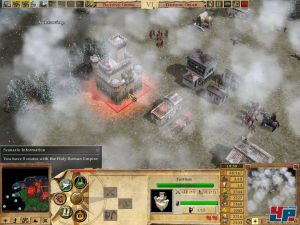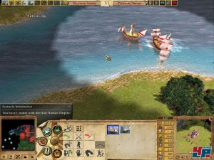 Gehandelt wird direkt auf der großen Karte, indem ihr schlicht mit anderen Völkern Waren austauscht. Dazu errichtet ihr wie bei Rise of Nations Märkte, von denen aus die Händler losziehen. Wahlweise könnt ihr auch den Hafen eures Handelspartners ansteuern, wozu ihr Handelsschiffe bauen müsst. So gelangt ihr an Gold, wenn ihr es nicht selbst abbauen könnt. Die Handelsroute symbolisiert praktischerweise ein Strich auf der Karte. Im eigenen Territorium könnt ihr auch Straßen errichten, die die Bewegung beschleunigen. Leider nur nettes Beiwerk, das ohne große Bedeutung für den Sieg bleibt. Schon eher wichtig sind da die Brücken, mit denen eure Truppen über den Fluss kommen. Verlangsamt werden eure Einheiten vom schlechten Wetter, das sichtbar auf dem Bildschirm tobt.