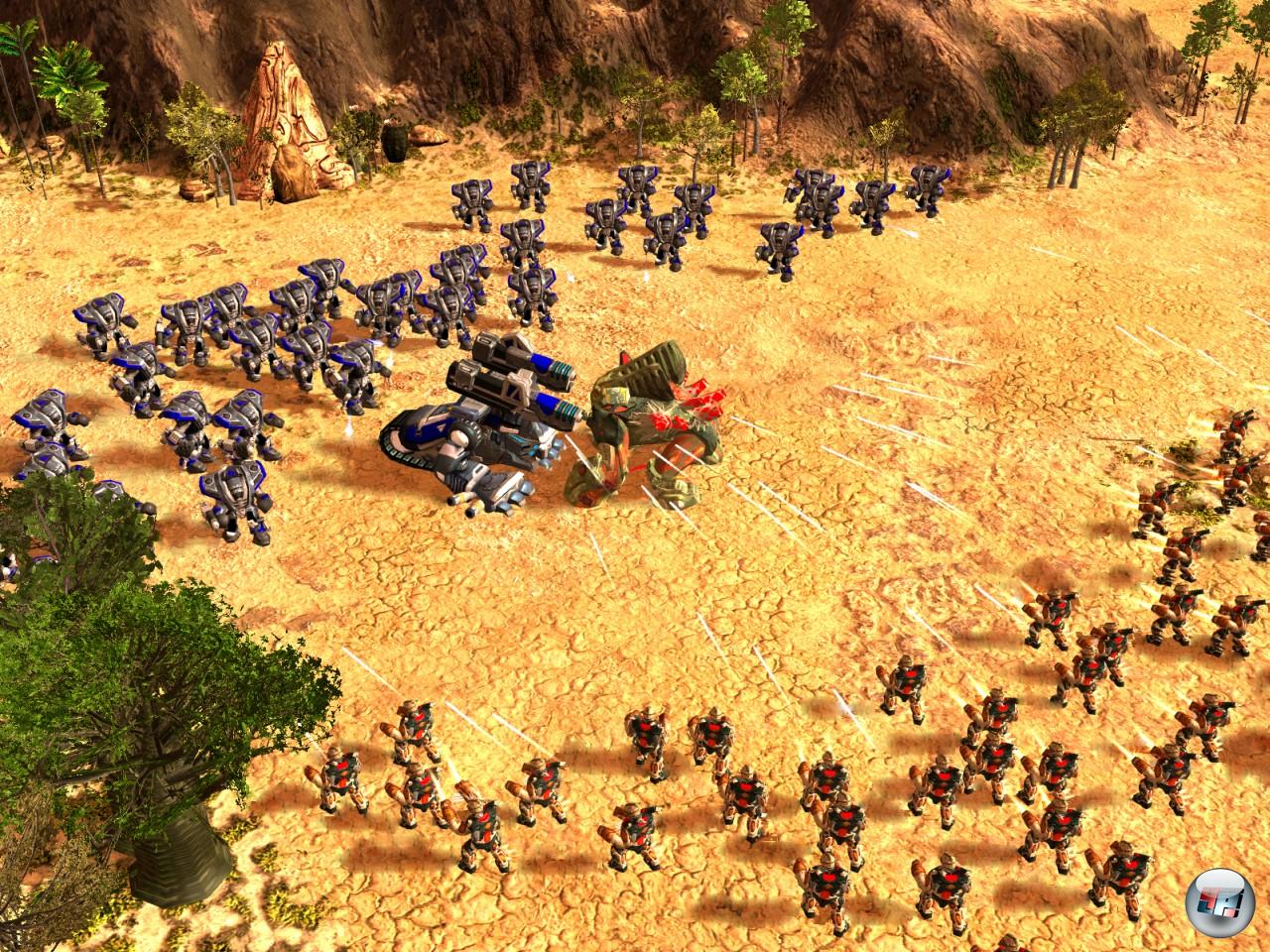 Und was erwartet euch im Scharmützel für eine Computerintelligenz? Die ungepatchte Verkaufsversion hinterlässt – auch hier – einen schlechten Eindruck, wobei man nicht trennen kann, ob die KI unfertig, bugverseucht oder schlichtweg unfähig ist. Zwar schaffen es die Computergegner meistens eine Basis aufzubauen (kein Wunder bei der Vereinfachung) und manchmal mit Mauern und Türmen zu schützen, jedoch vergessen sie dabei irgendwie die Einheitenproduktion. Oftmals kann man in aller Seelenruhe eine Basis aus dem Boden stampfen, bekommt ohne neutrale vorplatzierte Gegner keine Feinde zu Gesicht und werdet mit viel Glück mal angegriffen, sofern der Computergegner erstens eine Armee hat und zweitens die Recken den Weg zu eurer Basis gefunden haben und falls doch, dann suchen die Feinde keinen Weg um die Verteidigungsanlagen herum, sondern laufen direkt rein.