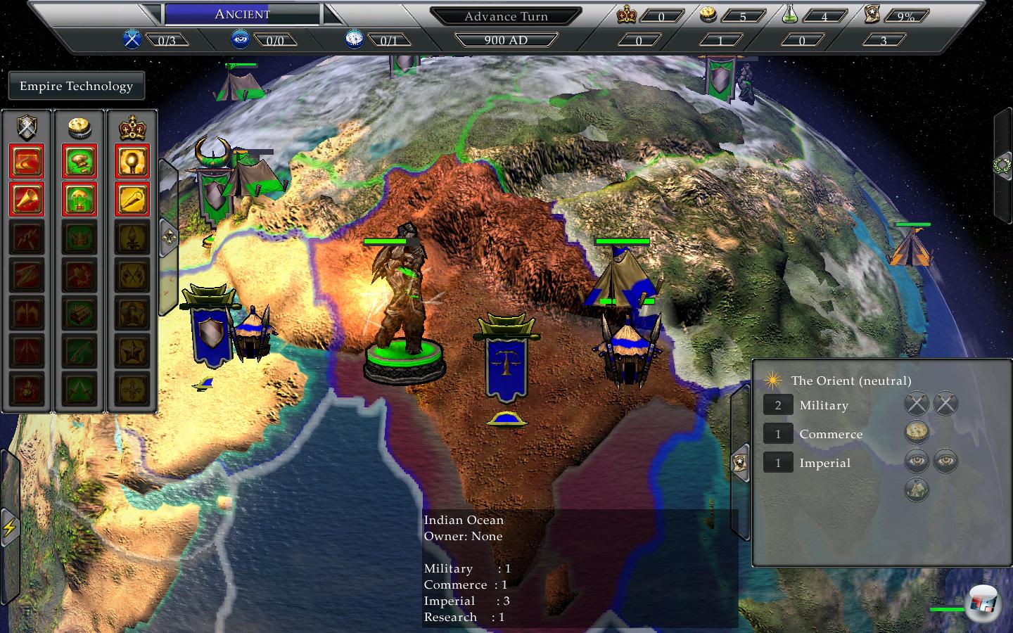 Welteroberungsmodus statt einer Kampagne einzubauen und was in unserer Vorschau einen durchaus ambitionierten Eindruck hinterließ, spielt sich im Endeffekt wie eine langweilige Serie aus schnöden, aneinander gereihten, ungenügend ausbalancierten Scharmützeln, unterbrochen von ein bisschen Risiko auf einem 3D-Modell der Erde. Dort verschiebt ihr Armeen, erforscht globale Technologien (z.B. Coup-d-Êtat (Staatsübernahme durch Spione) oder Infrastruktur (zügigere Truppenbewegungen)) und strebt die Weltherrschaft an. Jede eurer Ländereien produziert Ressourcen und/oder Forschungspunkte (zum Epochenaufstieg), beziehungsweise könnt ihr jedem Gebiet zuweisen, ob Ökonomie, Militär, Imperiumspunkte oder Wissenschaft im Vordergrund stehen sollen, je nach Effektivitätsgrundlage des Gebietes. So werden Armeen aufgestellt, in Runden-Manier verschoben und die einzigen strategischen Überlegen ranken sich um die Frage „Wann greife ich wo an?“. Ausgetragen werden die Schlachten, wie ihr euch