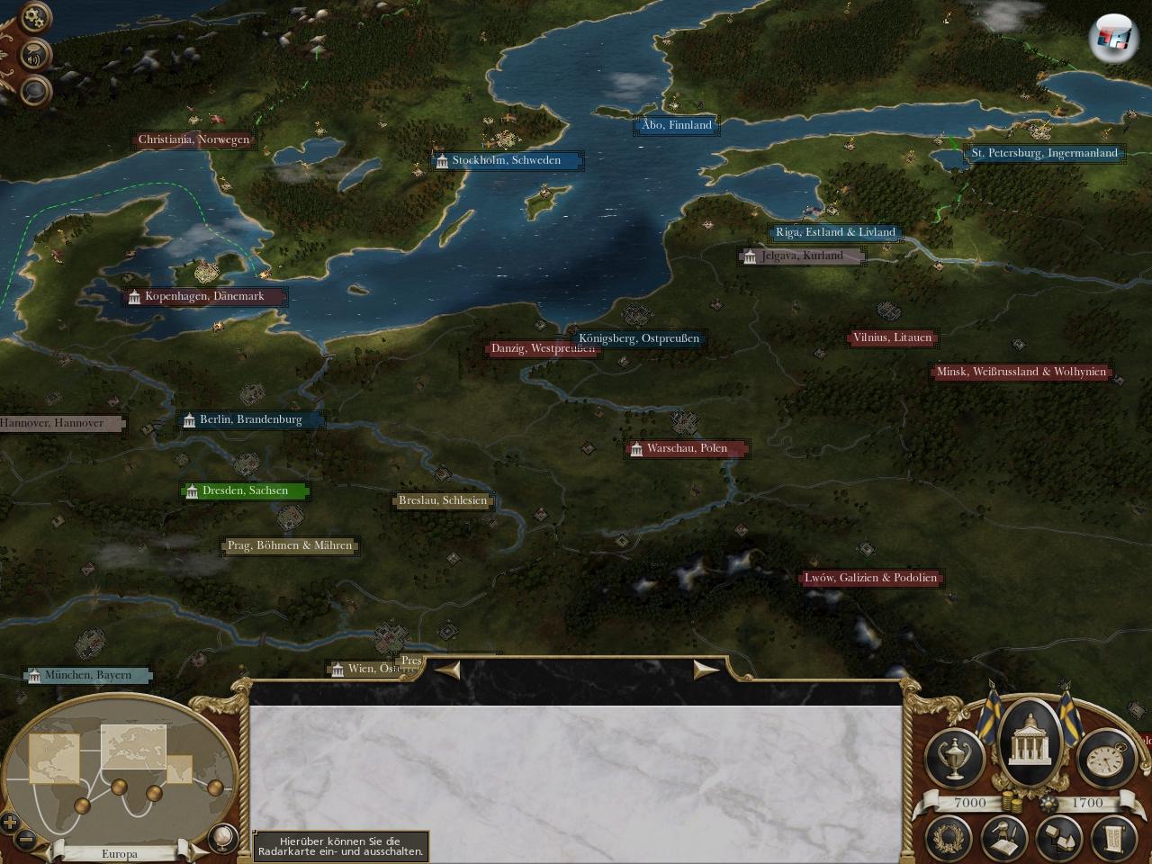 Allerdings ist der König diesmal eine Figur im Hintergrund, der seinem Rat aus Ministern vorsitzt und nicht aktiv auf der Karte unterwegs ist – da ziehen lediglich Generäle und Armeen sowie Agenten und Missionare umher. Überhaupt wirkt das Geschehen auf der Karte wesentlich aufgeräumter, da es weniger verstreute Heerhaufen, sondern größere Armeen gibt. Das ist nicht nur historisch korrekter, sondern sorgt auch dafür, dass man sich nicht in vielen unnötigen Scharmützeln verzetteln muss. Man kann sich auf das Wesentliche konzentrieren und eine Strategie entwickeln, die sich mit der Hauptstreitmacht des Feindes beschäftigt. Aber vorher sollte man vor der eigenen Haustüre kehren und sich optimal aufstellen: Der König kann seine Minister hinsichtlich ihrer Fähigkeiten in Ämter wie die Militär- und Marineverwaltung, die Staatskasse oder Justiz berufen oder feuern, wenn bessere Leute anklopfen. Ihre zusammen gerechneten Fähigkeiten wie „+2 Zufriedenheit Adel“ oder „-4% Kosten Schiffsbau“ wirken sich auf viele Bereiche wie die innere Sicherheit, die Forschung oder die Kosten neuer Einheiten aus – also sollte man immer wieder austauschen. Trotzdem erreicht das Personenmanagements nicht die Gewichtung wie etwa in Civilization IV: Colonization <a class="DYNLINK" onmouseover="DynToolTipp_Show('Klicken für Gameinfos‚)“ onmouseout=“DynToolTipp_Hide(); “ href=“javascript:DynCont_Display(‚Gamefinder‘,’runmod.php?sid=%7BSID%7D&LAYOUT=dyncont_gf&spielid=203478′)“>, wo es wirklich auf jede Fachkraft ankommt. Dafür faszinieren hier andere Elemente.
