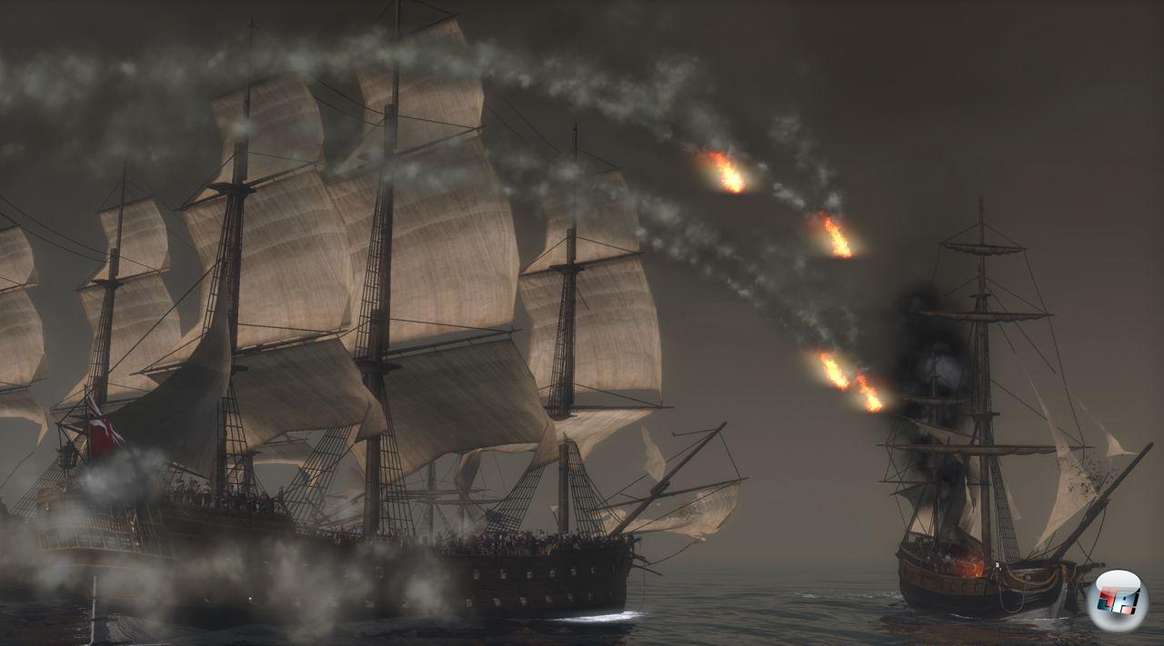 Für Echtzeitkämpfer bieten die Schlachten auf dem Wasser ganz neue Möglichkeiten, denn zum ersten Mal kommandiert man Schiffe von der Schaluppe über die Galeone bis hin zu Briggs und Linienschiffen auch in Gefechten – inklusive maritimer Formationen wie Dwarslinie, Kiellinie und Sichel sowie schneller Gruppierungen. Das sanft wogende Meer sieht klasse aus, die Schiffe wurden getreu ihrer historischen Vorbilder nachgebaut und man kann sogar an Deck zoomen und der Mannschaft zusehen, während der Wind aus den Boxen pfeift. Wer alle Details hoch schraubt, wird hier sehr viel maritime Luft schnuppern und den blanken Hans in seiner ruhigen Variante sehen können.
