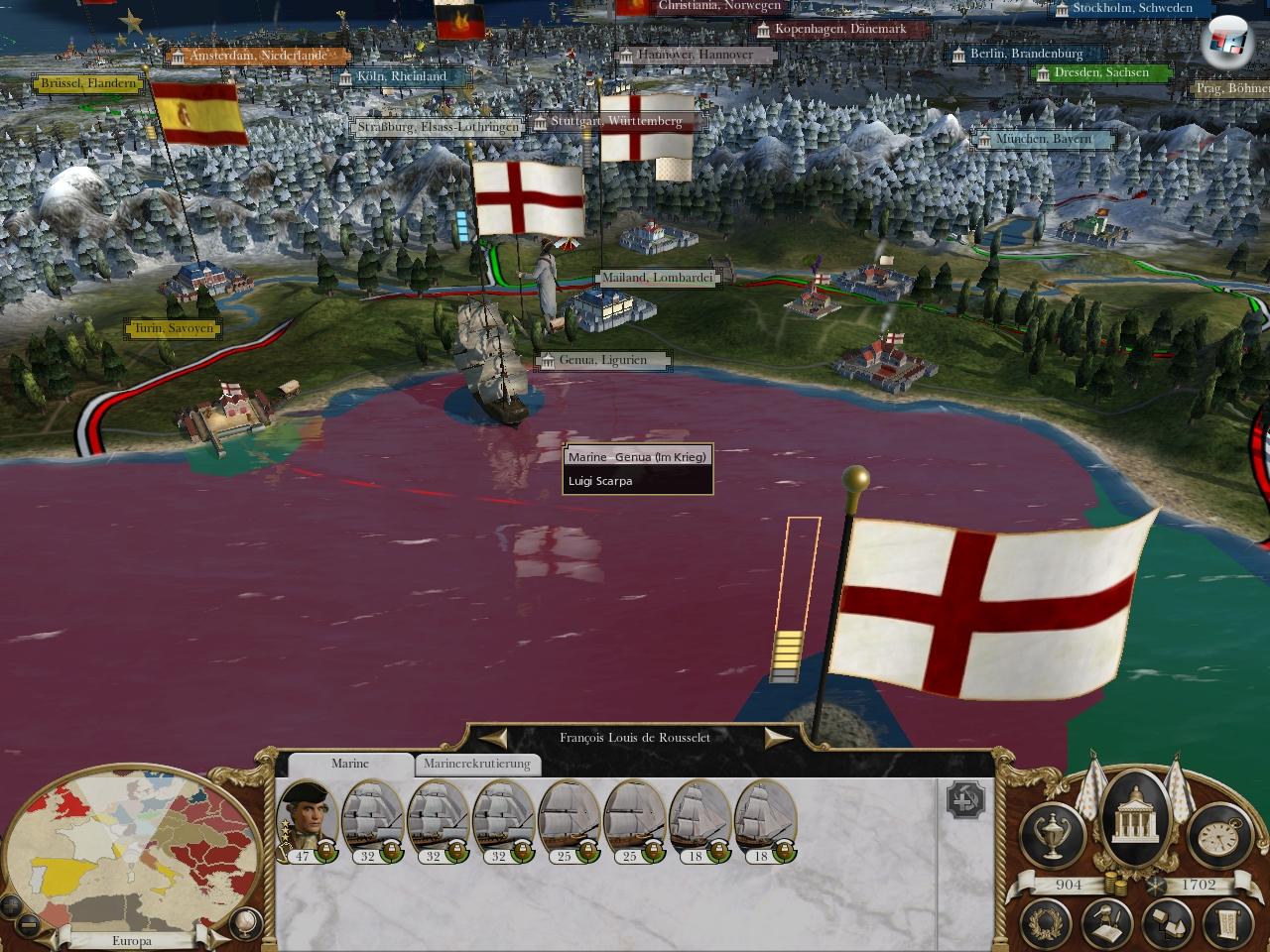 Auch auf der großen Strategiekarte hat der Seekrieg folgen: Man kann nicht nur eigene Armeen weit und schnell transportieren, sondern auch Häfen und damit den Handel blockieren, sowie gezielt einzelne Routen anvisieren und dort kapern – dann flackert die eigene Fahne zwischen dem Original und dem Totenkopfzeichen und der Profit des Handels wandert in die eigene Kasse. Schade ist, dass man diese Blockaden nicht auch diplomatisch verhandeln kann – sprich: „Wenn du den Hafen nicht mehr isolierst, dann biete ich dir Waren, Gold oder den Frieden an.“ Aber wer auf diese Art und Weise vorgeht, wird ohnehin schnell den Unmut aller an diesen Routen beteiligten Nationen auf sich ziehen. Außerdem sollte die eigene Flotte all jene Ostindienfahrer vor Piraten schützen, die an der Elfenbeinküste oder in Südamerika Halt machen und dort sofort Gewinn einbringen. Übrigens: Wer wissen will, wie gut die Piraten in den Seegefechten abschneiden, sollte in die Karibik segeln und gegen Galeonen mit einer Feuerkraft von 188 sowie 176 Mann Besatzung antreten.
