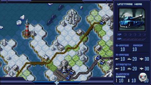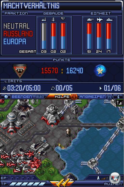 Nach einigen gewonnenen Schlachten schaltet ihr übrigens zusätzliche Karten frei, auf denen ihr außerhalb der Kampagne kämpfen dürft. Und wem das nicht reicht, der bastelt sich im Handumdrehen eigene Einsätze, auf denen er sowohl alleine als auch im WiFi-Duell in den Krieg ziehen darf. Auch wenn man im Gegensatz zu Advance Wars die Karten von Grund auf neu gestaltet: Zum flotten Erstellen einer schnellen Partie ist der Editor kaum geeignet, da ihr nicht die Position einzelner Hexfelder bestimmt, sondern lediglich den generellen geografischen Zustand von zwölf Hexfelder großen Vierecken festlegt. Sprich: Was im Editor eine 8×8 Felder große Karte ist, erscheint im Spiel als 32×24 großes Schlachtfeld. Das kostet nicht nur Zeit zum Eingewöhnen, es lässt euch auch nur vorgefertigte, vier Einheiten starke Truppenverbände auf einem der editierbaren Felder platzieren – welche Einheit genau wo steht, könnt ihr so nicht bestimmen. Und gerade das hat mir den Editor leider gründlich versäuert.