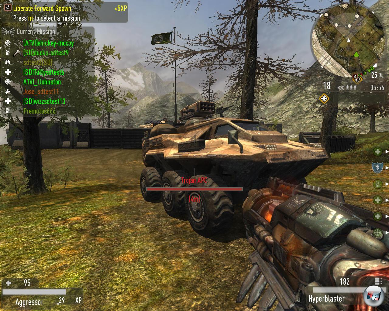 Die zwölf großen Karten bieten für jeden Themengeschmack etwas: Verschneite Berghänge, staubige Steppen, kalte Industrieanlagen und grünliche Waldgebiete bieten genug Abwechslung – es gibt sogar eine Omaha Beach-ähnliche Wolfenstein-Reminiszenz mit Gräben und Bunkern, die Scharfschützen zum Sniperfest einladen. Ihr habt die Wahl unter drei Spielvarianten: Die »Kampagne« reiht einfach drei Karten hintereinander ein, beim »Ziel« ist es nur eine – und auch nur eine Runde lang. Am interessantesten wird es bei »Stoppuhr«: Hier beginnt das eine Team wie üblich als Aggressor, das andere mimt den Verteidiger. Nach einer bestimmten Zeit werden die Rollen getauscht, allerdings haben die neuen Offensivlinge nun weniger Zeit, die Punktvorgabe ihrer Vorgänger zu übertreffen – sehr spaßig! Wollt ihr eure geplagten Sohlen schonen, habt ihr die Wahl unter 13 Vehikeln von Jetpacks über flitzige Speedbikes bis hin zu dicken Mechs, die meisten davon bieten Platz für mehrere Spieler. Bekommt ihr nicht genug Kameraden aus Fleisch und Blut zusammen, könnt ihr auch Bots mitspielen lassen, die zwar als Gegner hervorragend, fast schon zu gut sind, aber als Teamkameraden nicht viel taugen. In Sachen Bewaffnung bietet QW mit Railgun, Nailgun, dicke MGs, Plasmagranaten oder einem Raketenwerfer mit Zielerfassungssystem bekannte Standards. So weit, so schön, allerdings haben alle Strogg-Wummen einen serienmäßigen Nachteil: Wird gezoomt, gibt es einen zwar schön anzusehenden, aber den Blick für einen Moment verschleiernden Pixel-Effekt zu sehen – in einem rasanten Shooter wie diesem ist ein vergeudeter Moment oft genug auch der letzte.