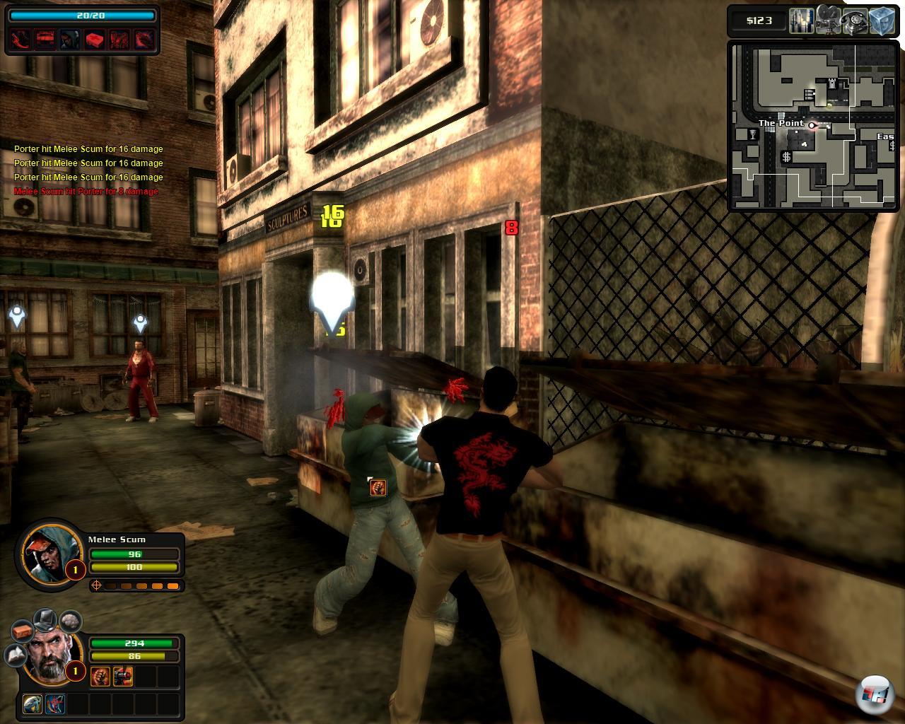 Eine größere Wahl habt ihr immerhin in Bezug auf die Fertigkeiten der drei Charaktere, denn ihr baut nicht nur deren Reservoir an Attacken und Verteidigungen auf, sondern greift auch auf so genannte Machtfähigkeiten zu. Dabei stehen allen „Gute-Menschen-Gaunern“ dieselben Fähigkeiten zur Verfügung, weil es sich um Unterstützung seitens der NSA handelt. So könnt ihr ein Fahrzeug anfordern, Soldaten an eure Seite rufen, ein Areal mit Giftgas „reinigen“ oder Autobomben platzieren. Weil ihr gegen das Bare, welches ihr nach der Übernahme von Stadtvierteln erhaltet, zudem eine Hand voll Gangster (Faustkämpfer, Schützen, Heiler oder Kundschafter) einstellen und gelegentlich den (viel zu kleinen!) Rucksack mit Medizin, Rüstung oder besseren Waffen füllen müsst, während euch kein Zeitlimit in den Rücken fällt und ihr die Viertel in beliebiger Reihenfolge übernehmen dürft, entwickelt das Spiel nach dem ungemütlich zähen Einstieg bald eine wohltuende Eigendynamik. Kümmert ihr euch wahlweise um die Bedürfnisse der Zivilisten und beseitigt bestimmte Verbrecher oder beschützt die Auftraggeber auf ihrem Weg zum Zielort, winken zudem mehr Zaster, zusätzliche Erfahrungs- oder Machtpunkte sowie wertvolle Gegenstände.