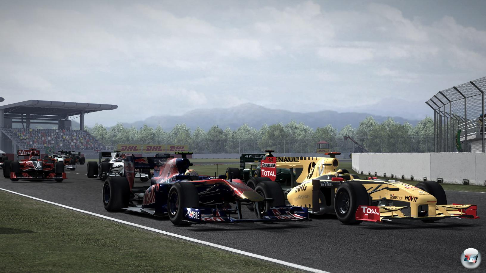 Doch das sind nicht die einzigen Wehwehchen, unter denen F1 2010 momentan noch leidet, denn auch die Boxenstopps sorgen in der aktuellen Version unter bestimmten Bedingungen für Frust: Beträgt die Renn-Distanz zehn Prozent und man verlässt sich auf die vorgeschlagene Strategie, kommt ein Großteil des Fahrerfeldes gleichzeitig rein, um sich neue Reifen abzuholen. An sich keine große Sache, doch sobald man als einer der Führenden den Boxengassen-Marathon eröffnet, wird man trotz eines perfekten Stopps schnell zum Leidtragenden. Warum? Weil der Lollipopp-Mann oft erst dann die Ausfahrt erlaubt, wenn die gesamte Verfolger-Kolonne an der Box vorbeigefahren ist. Entweder erhöht man also die Renndistanz oder weicht notgedrungen von der idealen Boxenstrategie ab. Zur Not kann man sogar spontan während des Rennens umplanen und Stopps auf Knopfdruck anfordern oder ablehnen. Ist man auf weichen Reifen unterwegs, die bei aktiviertem Verschleiß sehr schnell abbauen, ist der Spielraum für die Boxenstrategie allerdings sehr begrenzt. Von der Koordinationsproblemen abgesehen ist es allerdings schön zu sehen, wie die animierte Pit-Crew des eigenen und anderer Teams arbeitet. Auch die optionalen Möglichkeiten, den Begrenzer bei der Boxeneinfahrt manuell zu aktivieren und den Boliden eigenhändig bei den Mechanikern abzuliefern, ist eine feine Sache für alle, die ein möglichst authentisches F1-Feeling haben wollen.
