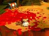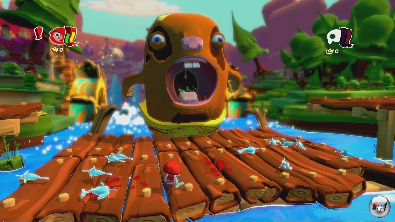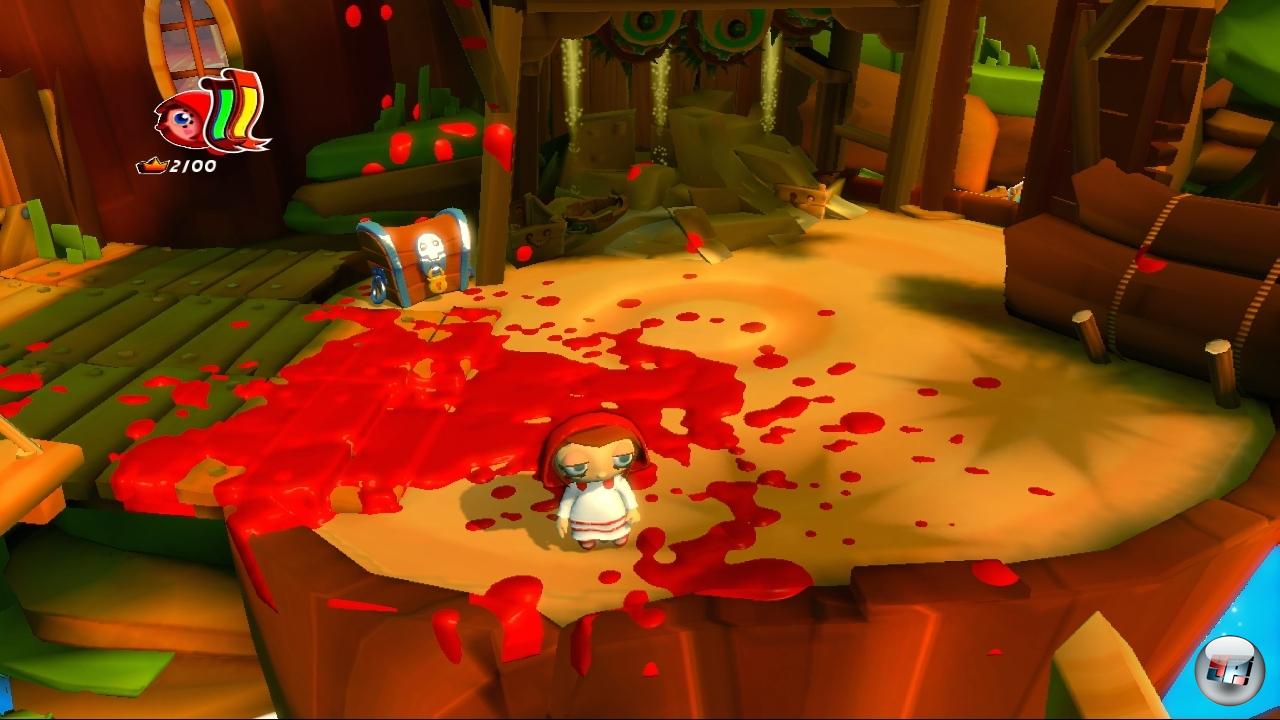 Rotkäppchen: Ach, die tun ja genau das Gleiche. Und ob du da jetzt alleine, zu viert, online oder offline rum rennst… Je mehr mitkommen, desto weniger blickt man ja, wo man überhaupt lang läuft – wenn dir nicht sowieso grad‘ die Einblendung von ’ner blöden Spezialattacke von irgendjemandem die Sicht verbaut! Ständig fällt man irgendwo runter… Oh, und eins flüster‘ ich dir: Über rosa Schokokekse zu springen, weil man sonst im Wasser ertrinkt, ist beknackter Nervkram! Ne, warte: Sich gegenseitig zu verprügeln is sogar noch hirnloser!