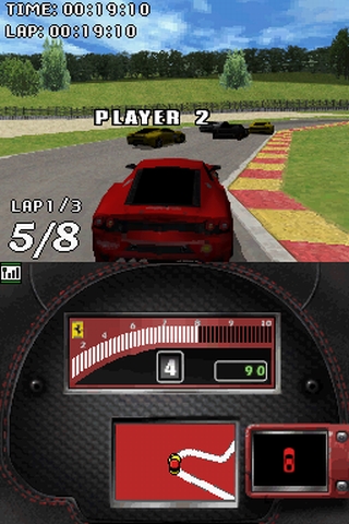 Wer glaubt, mit Ferrari Challenge eine Umsetzung des Originals zu bekommen, liegt falsch: Beim DS-Ausflug handelt es sich um eine völlig eigenständige Produktion, die sogar einiges besser macht als die Raserei von damals! Das geht schon beim Fuhrpark los, denn neben dem F355 findet ihr hier auch weitere Modelle wie den F575 GT Challenge, Fxx oder den F430 Challenge. Tretet ihr dann zum ersten Mal das Gaspedal auf einer der lizenzierten Strecken von Monza bis Hockenheim durch, wird euch erstmal der Atem stocken: Für DS-Verhältnisse ist die flotte 3D-Engine phänomenal und versetzt euch vor allem in der Innenansicht umgehend in einen Geschwindigkeitsrausch, wenn die Kulissen schon nach ein paar Metern in einem Affenzahn an euch vorbeirauschen. Zwar gibt es am Horizont immer wieder Pop-Ups zu sehen und auch in Kurven wird bei zu starkem Gegneraufkommen die Darstellung etwas ausgebremst, doch ist die Leistungsfähigkeit der Engine immer noch bemerkenswert, die immerhin neben den Kulissen auch noch sieben KI-Fahrzeuge jongliert. Das schafft sogar manches PS2-Spiel nicht!