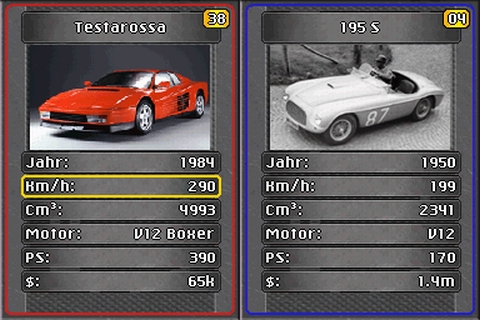 Wer sich nicht nur mit „Autobots“ auseinandersetzen möchte, begibt sich in den Multiplayermodus. Hier dürfen bis zu vier Ferraristi aus Fleisch und Blut zeigen, was sie in den italienischen Traumwagen leisten können. Dabei benötigt nicht jeder ein eigenes Exemplar des Spiels, sondern kann auch auf die Game-Sharing-Funktion zurückgreifen – schön. Nur schade, dass nicht auch Rennen über Nintendos Wi-Fi-Service unterstützt werden. Doch dafür dürft ihr sowohl alleine als auch mit Freunden über die direkte Funkverbindung das Bonusspiel genießen. Ich erinnere mich noch dunkel an Klassenausflüge zu Schulzeiten, in denen lange Busfahrten hauptsächlich mit einer Beschäftigung überbrückt wurden: Dem Zocken mit Autokarten. Genau das Gleiche bietet auch Ferrari Challenge – allerdings nur mit Autos aus Maranello. Klar. Dazu haltet ihr den DS wie bei Dr. Kawashima hochkant und entscheidet euch zwischen den Kategorien Baujahr, Km/h, Hubraum, Motor, PS und Preis für den Vergleich mit der Karte eures Gegenübers. Wer nicht nur unter Wettbewerbsbedingungen antreten möchte, kann die Sammelkarten auch einfach so mit seinen Freunden tauschen. Das Prinzip mag simpel und für Außenstehende etwas langweilig erscheinen, aber es ist ein wirklich netter Zusatz, der zeigt, dass dieses Konzept auch mit dem DS hervorragend funktioniert.