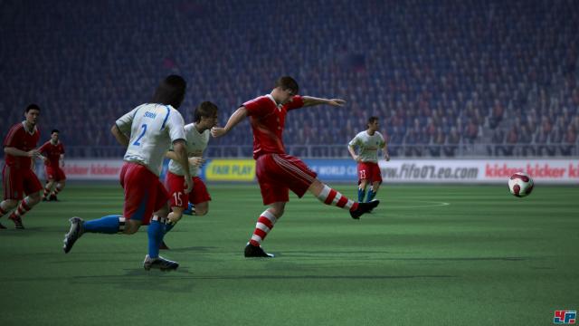Und genau das will EA auch: keinen Arcade-Kick, sondern eine reife Simulation. Eines muss man dem kanadischen Team lassen: Es beißt, es zeigt Ausdauer und will den Platz des ewigen Zweiten endlich verlassen. Bisher wurde der Ball in FIFA quasi in die Animation des Spielers geklebt. Das führte dazu, dass er wie ein Magnet am Fuß klebte – alles wirkte zu glatt, zu künstlich. Damit ist auf der Xbox 360 Schluss, denn erstmals werden das runde Leder und der