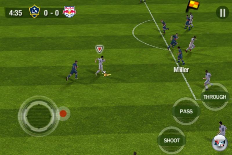 ein einziger Krampf: Hauptverantwortlich dafür ist die furchtbar ungenaue Steuerung mit ihrem virtuellen Stick und Knöpfen. Während man Letztere dank optionaler Größenanpassung relativ gut trifft, sind präzise Bewegungen mit dem linken Daumen kaum möglich. Egal ob mit der größeren Variante oder dem „Floating Joystick“, mit dem ich den virtuellen Stick praktisch an jede Stelle des Bildschirms anwenden kann – ich hatte zu keiner Zeit das Gefühl, dass die erstaunlich gut modellierten Kicker das gemacht haben, was ich eigentlich wollte – einzig das Dosieren der Schussstärke hat relativ gut funktioniert, da diese davon abhängig ist, wie lange man mit dem Finger auf den Bildschirm drückt. Ein weiterer Nachteil ist, dass ich mir durch das Rumgetatsche auf dem Bildschirm immer wieder die Sicht auf meinen Spieler und die Teamkameraden versperrt und so ständig den Überblick verloren habe. Und dann soll ich auch noch Mitspieler in den offenen Raum schicken, indem ich sie mit einer Slide-Bewegung berühre… Diese Steuerung ist ein einziger Krampf – und das trifft sowohl auf die zugänglichere Casual-Variante als auch die Profi-Version zu, bei der man die drei virtuellen Knöpfe auch noch durch Slide-Bewegungen verknüpfen muss. Übrigens ist die Casual-Steuerung nicht mit dem PSP-Pendant identisch, obwohl sie für die Apple-Geräte durchaus sinnvoll gewesen wäre: Während auf der Sony-Plattform die Laufarbeit von der CPU übernommen wird, bekommt man hier lediglich beschriftete Knöpfe auf dem Bildschirm und weniger Kombo-Möglichkeiten, aber muss die Kicker weiterhin selbst mit dem grausigen Joystick über den Platz scheuchen.