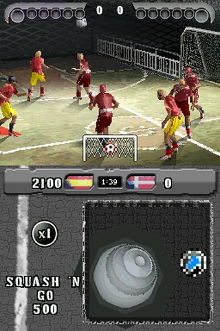 Warum sollte man in einem Fußballspiel auch dem Ball hinterher jagen? Stattdessen verharren sie in ihrer momentanen Stellung und schauen sich das Geschehen in aller Ruhe an. Doch der Hammer kommt erst noch – und ich bin froh, dass Jörg dank der Replay-Funktion Zeuge dieser schwachsinnigen Aktion werden konnte, denn ansonsten würdet ihr mir die folgende Schilderung vermutlich eh nicht glauben. Dabei kam es sogar mehr als einmal und auch mit verschiedenen Teams zu folgender Szene: Der gegnerische Torwart hat den Ball und wirft ihn seinem Feldspieler zu. Und was macht diese KI-Flachpfeife? Er dreht sich um, lässt einen Trick vom Stapel und versenkt das Ei im eigenen Kasten! Kein Scherz, er schießt bewusst ein Eigentor ohne Fremdeinwirkung oder einen unglücklichen Abpraller! Was kann ein Fußball-Spiel eigentlich noch schlechter machen? Ich weiß es: Leblose Pixel-Plätze mit einer Einheits-Farbpalette und eine fummelige Steuerung, bei der der Trick-Stick tatsächlich auf den Touch-Screen gelegt wurde. Ihr ahnt es sicher schon: In der Praxis funktioniert diese Umsetzung äußerst bescheiden, also solltet ihr den Touchscreen lieber von der Daumenreiberei verschonen und euch auf den Zufalls-Trick verlassen, den ihr wesentlich bequemer mit der Y-Taste aktiviert. Konter-Möglichkeiten gibt es verglichen mit den Konsolenversionen übrigens keine und genau wie bei der PSP-Version hat der erweiterte Gamebreaker mit Toreklau und K.O.-Trickserei ebenfalls nicht den Weg in die DS-Umsetzung gefunden. Selbst neue Perspektiven sucht ihr vergeblich, so dass ihr immer mit der nahen oder fernen Seitenlinien-Ansicht Vorlieb nehmen müsst. Entscheidet ihr euch für die Nahansicht, verschwindet der Ball oft am unteren Bildschirmrand und folglich geht die Übersicht verloren. Da stellt sich natürlich die Frage, was auf Nintendos Handheld eigentlich neu oder verbessert worden sein soll… Die Antwort ist schnell gefunden: Nichts. Nada. Niente. Bis auf neue Bolzplätze und Gimmicks entspricht die Spielmechanik 1:1 dem alten Fifa Street. Tolle Wurst, aber Hauptsache eine „2“ hinter den Namen geklatscht, EA!