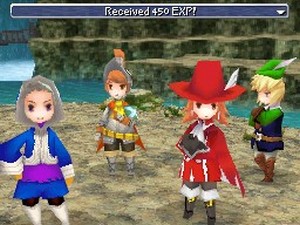 Squeenix-Niveau, komprimierungsbedingt vielleicht etwas krümelig, aber toll geschnitten, toll animiert und mit großartiger Musik unterlegt – wie der Rest des Spiels auch, aber weniger erwartet man auch nicht aus der Feder von Altmeister Nobuo Uematsu.Fans von typisch japanischen Knuddelaugen-auf-großen-Köpfen-Helden werden diesen Seufzer übrigens noch weitaus öfter ausstoßen: Die niedlichen, puppenhaften Figuren sind putzig designt und ebenso animiert, alles ist irgendwie knuddelig – seit den Dreipixelhochs der NES-Zeit hat sich nachweislich einiges getan! Das ganze Spiel ist jetzt komplett in 3D; jeder Dungeon, jedes Monster besteht aus texturierten Polygonen, die flott über die beiden Bildschirme geschaufelt werden: Tummelt ihr euch auf der Landkarte, lauft, schwimmt, fliegt oder Chocobo-reitet ihr auf dem unteren Screen, während oben eine Übersichtskarte die bereits entdeckten Ortschaften abbildet. Innerhalb von Dungeons oder Städten bleibt der obere Schirm schwarz, bis man das Menü aufruft, das dann nach unten rückt. Alles stilvoll, alles schön – und bei Kämpfen von ansehnlichen Effekten umrahmt.