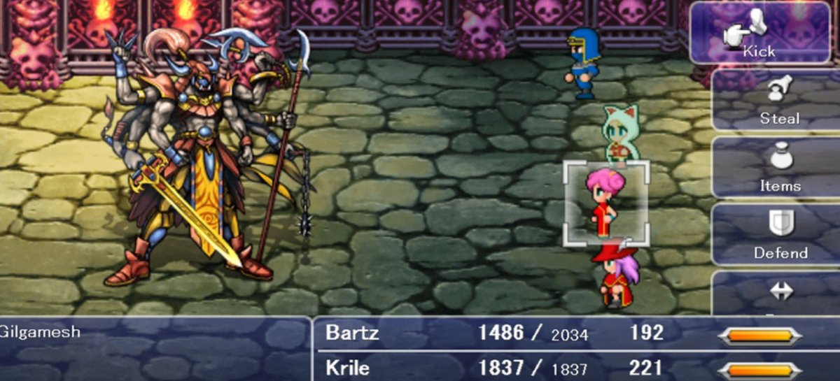 Das Kampfsystem setzt hingegen auf altbewährte Final-Fantasy-Tugenden. Ständige Zufallsbegegnungen und Echtzeit-Gefechte, in denen Ihr Euren Gegnern mit Waffen- und Zaubergewalt kräftig einheizt, waren schon vor zehn Jahren ein Markenzeichen der Serie. Im Gegensatz zum vierten Teil erfreut Ihr Euch jedoch neben der individuelleren Charakterzucht auch über ein weitaus handlicheres Item-Management sowie eine aufrufbare Landkarte. Ansonsten sind die spielerischen Unterschiede minimal. Auch in Final Fantasy V bereist Ihr eine ausladende Oberwelt und durchforstet monsterverseuchte Wälder, Höhlen, Dungeons und Tempel nach Schätzen und wichtigen Items, während in Städten oder Dörfern Hinweise gesammelt und Ausrüstungsgegenstände erworben werden.