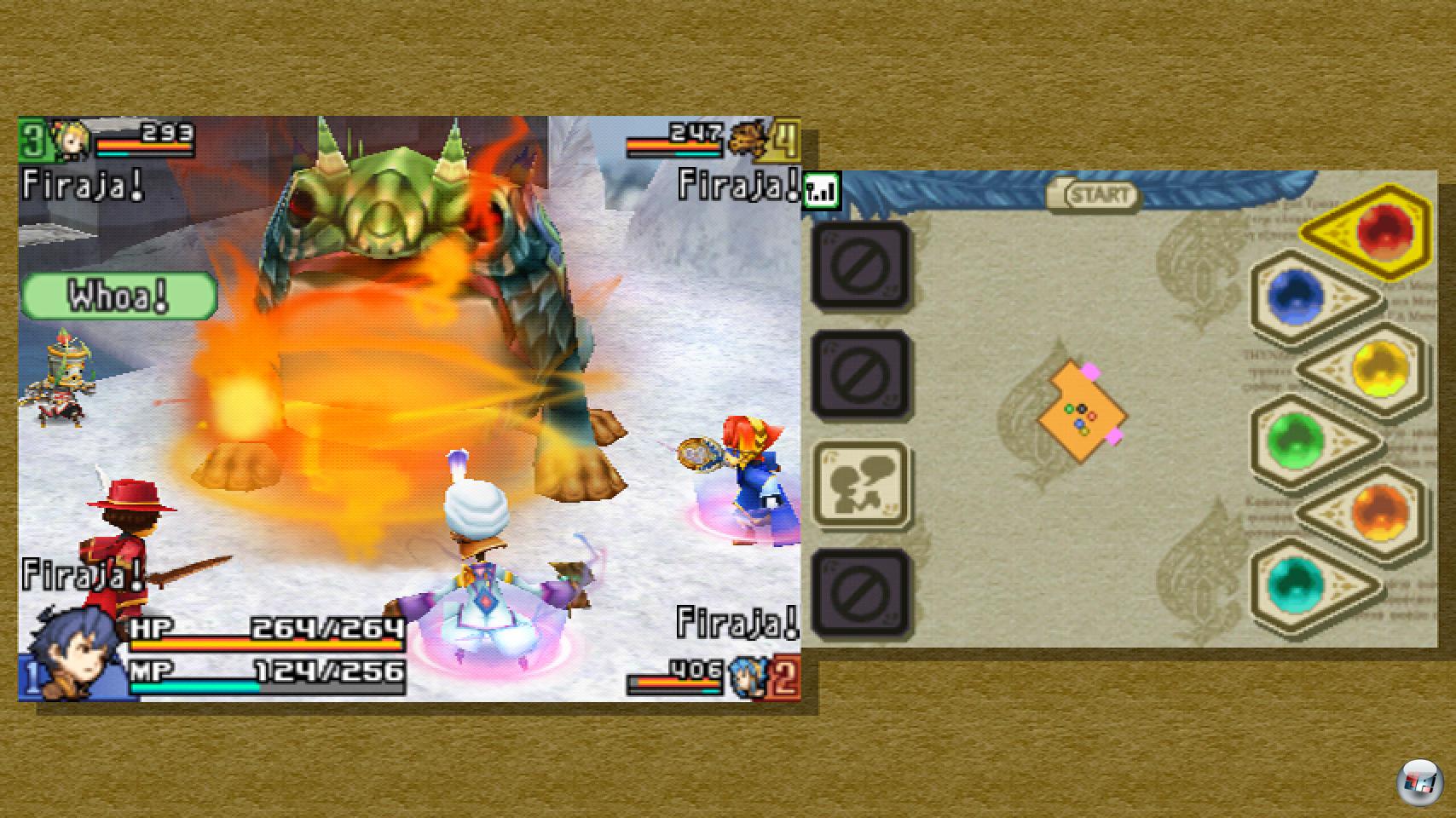 Wii-Spieler müssen aber noch ganz andere Einschränkungen über sich ergehen lassen. Da Echoes of Time eigentlich ein DS-Spiel ist, wird es auf der Konsole lediglich emuliert und das sieht man dem Titel leider deutlich an: Die Grafik wirkt wie ein schlechter Scherz, die Soundkulisse ist trotz hörenswerter Kompositionen äußerst bescheiden und die Bildschirmnutzung eine Zumutung. Ein großer Teil der Mattscheibe bleibt völlig ungenutzt, während in zwei kleinen Fenstern der Dualscreen des DS simuliert wird.