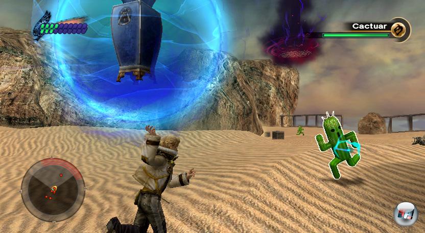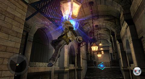 | Layles telekinetische Kräfte sind vielfältig einsetzbar: Man kann NPCs Gegenstände entreißen, Elemente der Spielumgebung manipulieren oder sich wie hier über Abgründe schwingen. |