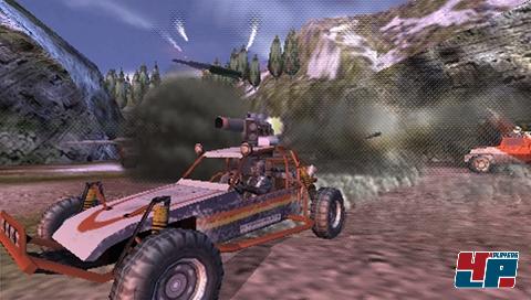 Mit dem schwer bewaffneten Buggy heizt ihr durch das Gebirge.