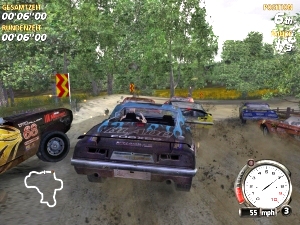 Auf den ersten Blick sieht FlatOut wie ein normales Rennspiel aus. Gut, das mit fetziger Musik unterlegte Intro jagt Autoliebhabern, die ihren Lack gerne mit einem fusselfreien Läppchen wienern, ein wenig Angst ein, aber sonst herrschen im Hauptmenü bekannte Standards: Solisten bekommen eine Karriere vorgesetzt; außerdem gibt es noch Zeitrennen und eine flotte Runde für alle, die es eilig haben. Die Mehrspielervariante offeriert an den Konsolen entweder Splitscreen-, Hotseat- oder Systemlink-Spiel (Xbox), am PC kommt noch ein LAN-Modus dazu – eine Online-Variante gibt es nur via Xbox Live.