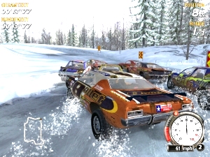 Die Karriere ist der wichtigste Modus: Hier spielt ihr hauptsächlich um Geld, aber auch, um weitere Spielvarianten und Boni freizuschalten. Doch zuallererst wählt ihr unter insgesamt 16 hart an der Schrottgrenze vorbeischliddernden Karren, die einen wundervollen Gegensatz zu den hochglanzpolierten Kisten aus NFS Underground & Co. darstellen. Allerdings bekommen Markenfetischisten hier keine echten Muscle-Cars vorgesetzt, stattdessen gibt es Phantasiegebilde namens »Blockhead«, »Grinder« oder »Bullet«. Vom verdienten Geld könnt ihr euch entweder bessere Autos leisten, oder das vorhandene ordentlich aufmotzen: Ob Auspuff, Chassis, Motor oder Bremsen – alles kann verbessert werden, was sich in mehr Geschwindigkeit oder zuverlässigerem Bodenkontakt äußert. Allerdings könnt ihr nur begrenzt Teile kaufen, außerdem kommt ihr an die besseren Stücke erst ran, wenn ihr die billigeren erworben habt. Ärgerlich ist auch das Fehlen einer Garage, in der man seine Schmuckstücke aufbewahren kann – ihr dürft nur ein Auto haben. Merkt ihr, dass ihr mit eurem Hobel, in den ihr viel Geld gesteckt habt, kein Land mehr seht, müsst ihr ihn erheblich unter Wert verkaufen, und euch einen neuen fahrbaren Untersatz zulegen. Fieserweise ist