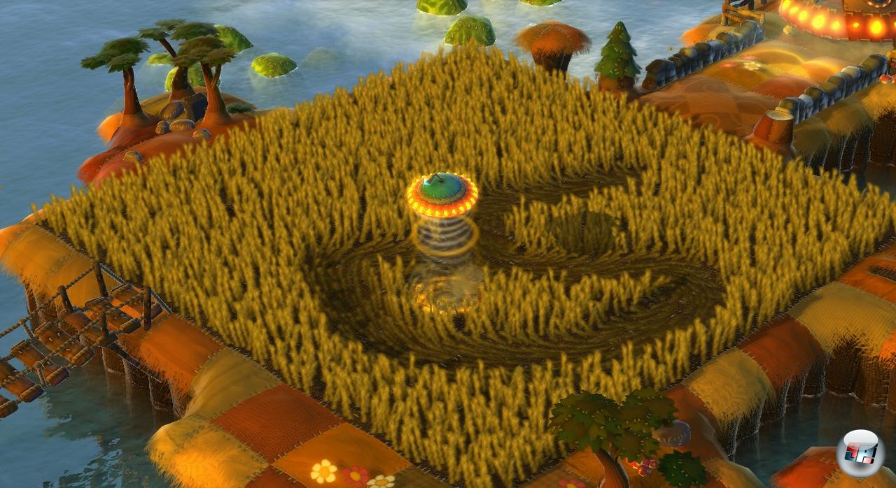Technisch erinnert Flock im besten Sinne an LittleBigPlanet <a class="DYNLINK" onmouseover="DynToolTipp_Show('Klicken für Gameinfos‚)“ onmouseout=“DynToolTipp_Hide(); “ href=“javascript:DynCont_Display(‚Gamefinder‘,’runmod.php?sid=%7BSID%7D&LAYOUT=dyncont_gf&spielid=11407′)“>: Die Umgebung wirkt wunderbar verspielt, die Landschaft sieht aus, als wäre sie aus vielen unterschiedlichen Stofffetzen zusammengenäht worden. Die kleinen Schafe sind wunderbar wollig-kuschelweich, hüpfen panisch durch die Gegend und machen dabei drollige Geräusche – »boingboingquiiiiekboing!« schallt es durch den Wald. Dazu zappeln fröhliche Country-Melodien aus den Boxen, die Hauptmenü-Musik ist eine herrlich überdrehte Parodie auf UFO-Filme aus den 50er Jahren.