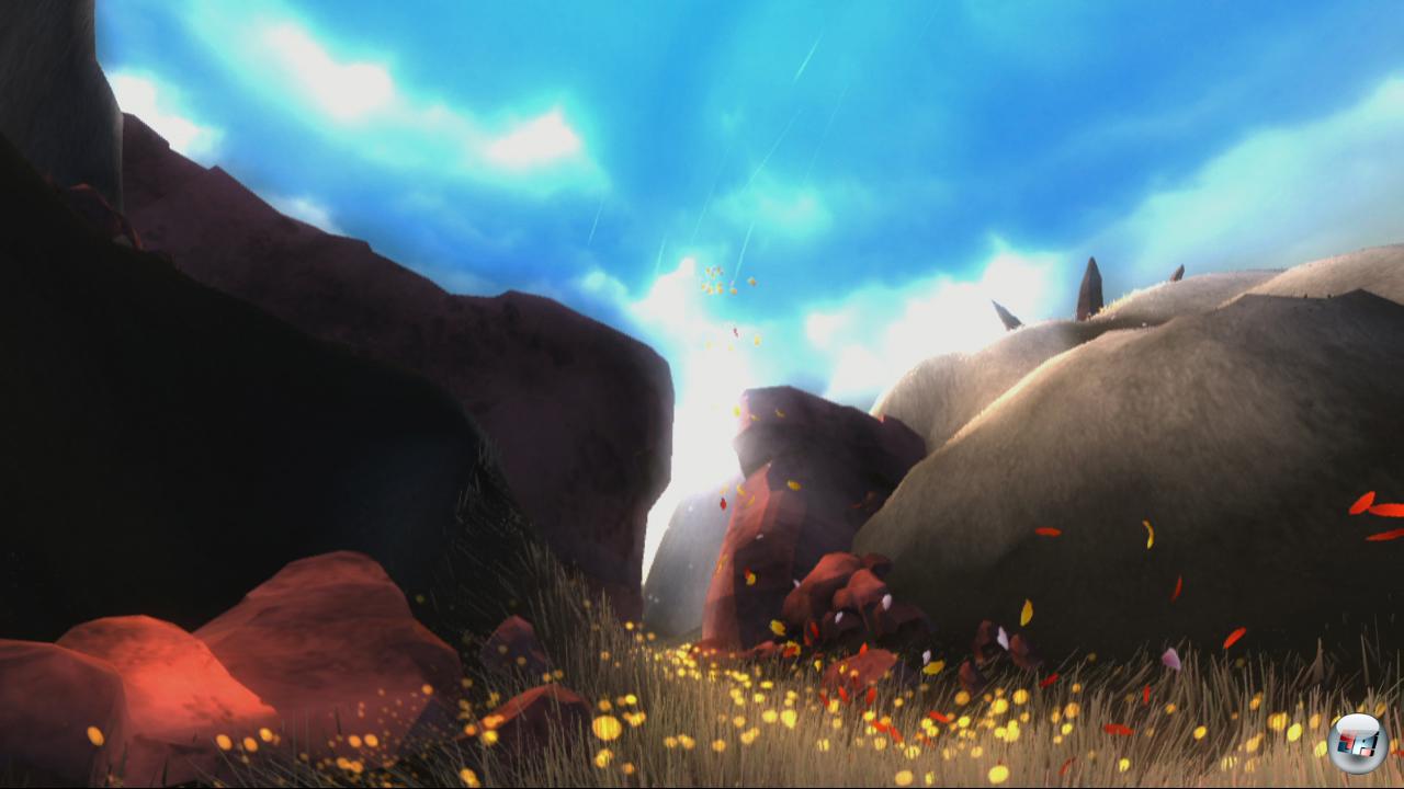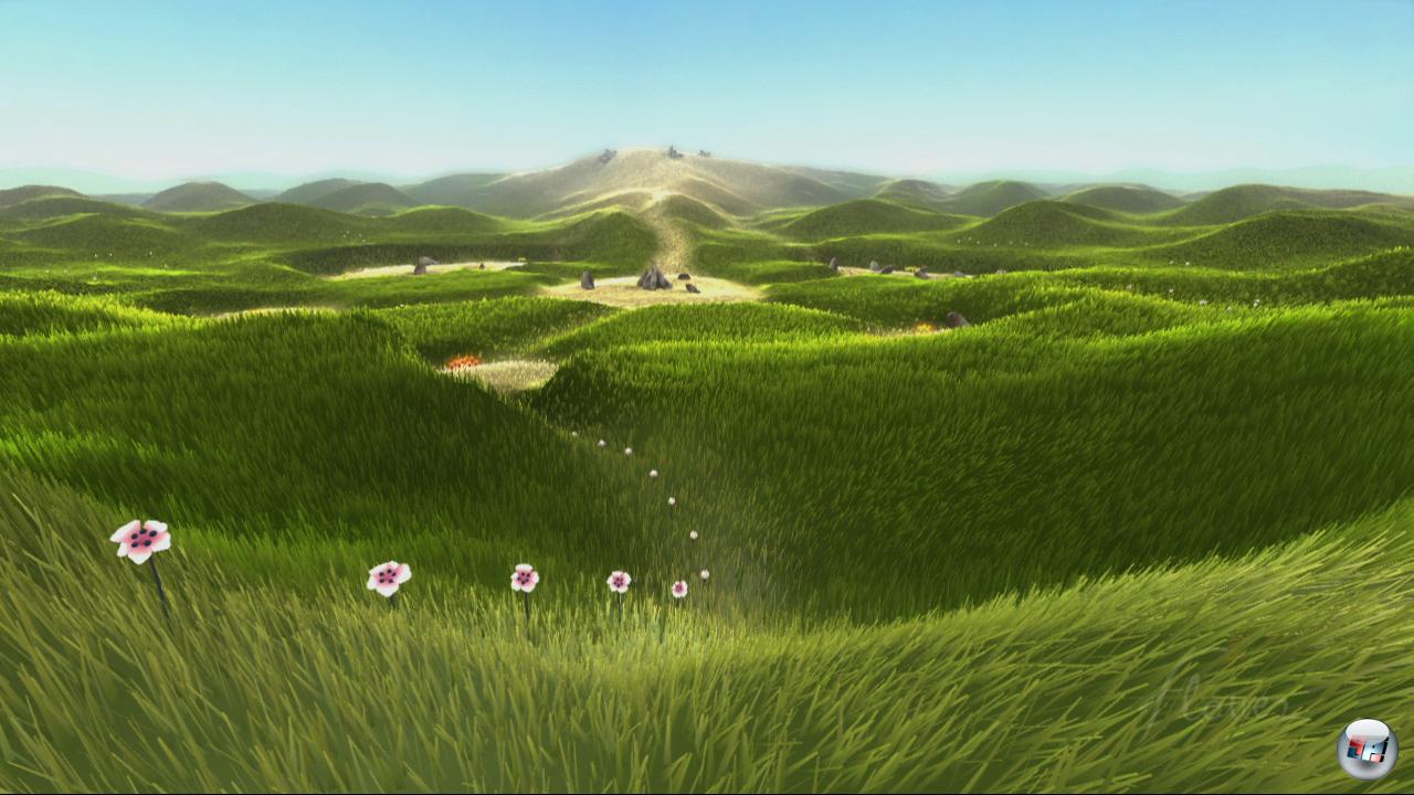 Ich drücke X und rase wie ein ICE durch das hohe Gras, während sich links und rechts hunderte Halme ehrfurchtsvoll verneigen. Hinzu kommt das akustische Feedback: Bei jedem Kontakt mit einer Blüte begleiten mich sanfte Klavieranschläge, die eine fortlaufende Melodie ergeben, wenn ich den Kurs halte – ja, zu Beginn wird man vor allem technisch beeindruckt. Gegen diese lebendige Flora mit ihren hunderttausenden gleichzeitigen Animationen von einzelnen (!) Stengeln, Blättern und Blüten wirken die Landschaften von The Elder Scrolls IV: Oblivion <a class="DYNLINK" onmouseover="DynToolTipp_Show('Klicken für Gameinfos‚)“ onmouseout=“DynToolTipp_Hide(); “ href=“javascript:DynCont_Display(‚Gamefinder‘,’runmod.php?sid=%7BSID%7D&LAYOUT=dyncont_gf&spielid=6001′)“>