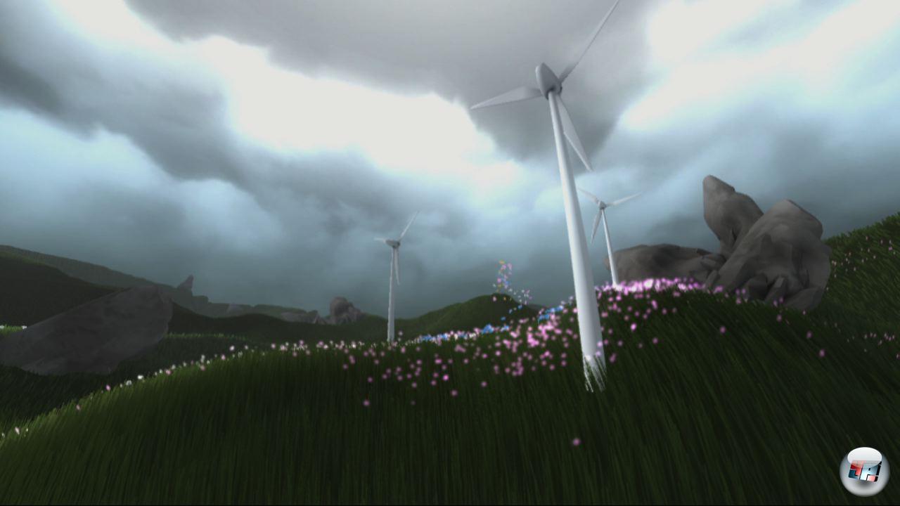 Manchmal gerät man in Windkanäle, die den Blütenschwarm noch mal stark beschleunigen und fast ein Rennspielgefühl vermitteln, denn gleichzeitig kann man oben, unten, rechts und links auf verschiedenen Spuren Bonusblumen einsammeln. Manche geben einen zusätzlichen Boost, andere beleben die Umgebung oder schalten seltene grüne Blumen frei. Und wer die Landschaft genau erforscht, wird belohnt: Es gibt versteckte Abzweigungen und Höhlen, die man nutzen kann, um weitere Blumen einzusammeln.