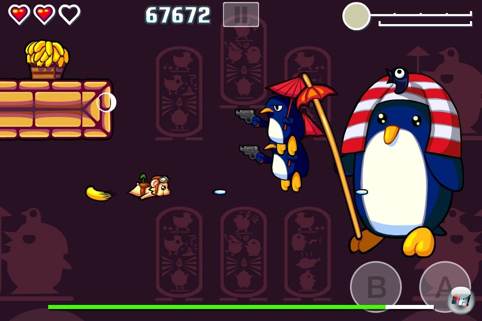 All das wird im niedlichen Intro gezeigt, das stilprägend für den Rest des Spiels ist: Alles ist niedlich, putzig, knuddelig, und im Falle des iPhone 4 auch nativ fürs Retina-Display gemacht. Der Hintergrund scrollt weich wie Hamsterfell in mehreren Ebenen, die Gegner sind witzig animiert und alles ist dank dicker Striche und heller Farben schön comichaft gestaltet. Das Spielprinzip ist sehr simpel: Newton fliegt automatisch, die Gegner kommen ihm (meist) von der rechten Seite entgegen und fallen idealerweise seinen Waffen zum Opfer. Davon gibt es acht Stück: Standardmäßig deckt er Feinde mit seiner Dauerfeuerspucke ein, die aber schnell an ihre Durchschlagsgrenzen stößt. Besser wird’s mit Schnellfeuer-Sonnenblumenkernen, einem Apfel-Streuschuss, Bier-Laser, Bumerang-Bananen oder einem Fackel-Flammenwerfer – die sind aber nur begrenzt munitioniert. Jede Waffe kann auf zwei Arten abgefeuert werden: Normales Dauerfeuer oder durchschlagskräftigerer Schuss, der aber erst kurz aufgeladen werden muss.
