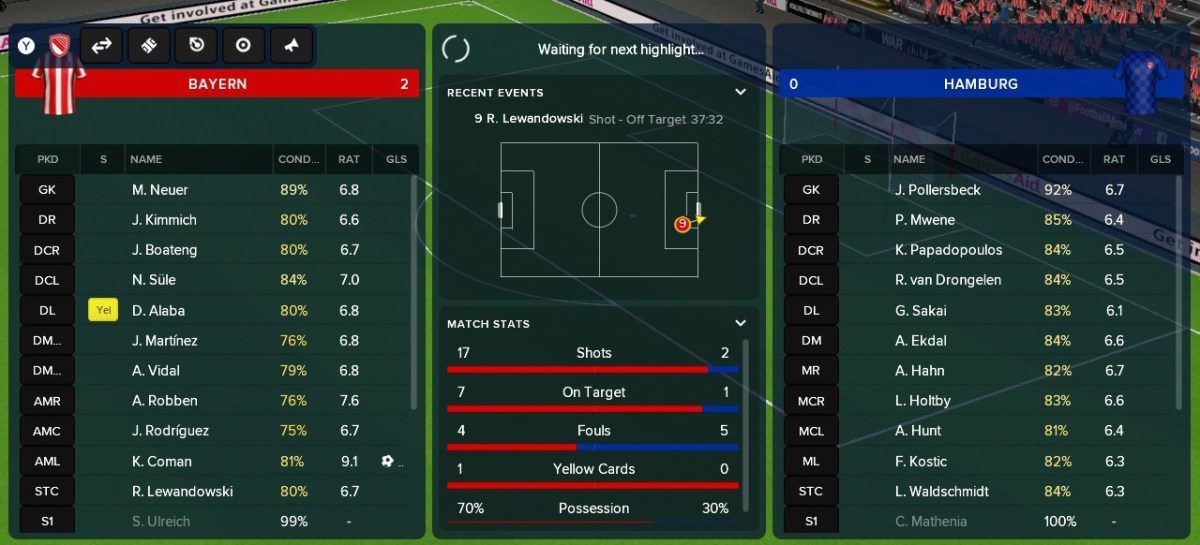 Und was bedeutet dies für den Nachwuchs-Manager vor dem Bildschirm? Das erste, was auffällt: Gespräche wurden nahezu komplett entfernt. Das betrifft aber nicht nur die Ansprachen vor oder nach dem Spiel bzw. die Pausenmotivation für Team oder Einzelspieler. Auch Vertragsgespräche mit Fußballern oder Beratern gibt es keine mehr. Man kann über Interviews keinen Einfluss mehr auf eigene Spieler bzw. die der nächsten Gegner Einfluss nehmen oder ihren Trainer herausfordern. In Krisensituationen, so etwa, wenn ein Spieler mehr Spielzeit im ersten Team für sich wünscht, da er sonst z.B. aus der Nationalmannschaft fliegen könnte, gibt es zwar Anfragen. Doch diese lassen sich mit einer einsätzigen Antwort abarbeiten. Ich habe dem „großen“ Football Manager zwar in den letzten Jahren immer wieder vorgeworfen, dass die auf Dauer (sprich: nach zig Saison) gleichförmigen Gespräche ihr Potenzial nie ausschöpfen. Doch erst, wenn sie (wie hier) fehlen, wird einem bewusst, wie sehr sie einen in die fiktive Fußballwelt ziehen und die eigentlich auf Statistikwerte und auf dem Platz mal mehr, mal weniger gut animierte Spieler reduzierten Athleten mit virtuellem Leben versehen. Ganz abgesehen davon, dass die Unterhaltungen relevante Auswirkungen nach sich ziehen – sowohl positiver als auch negativer Natur, wenn man sich unklug verhält. Dementsprechend gibt es auch keine Team-Dynamik mehr, die sich auf dem Spielfeld auswirken könnte.