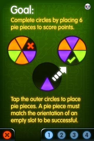 In der Mitte des Spielfelds erscheint z.B. ein lila Tortenstück auf zwölf Uhr, das man per Fingerdruck in einen von sechs Kreisen manövrieren kann – dort wird es dann ebenfalls an der senkrechten Mittagsposition abgelegt. Allerdings hat man dafür nicht viel Zeit und sobald das erste Stück platziert wurde, kommt auch schon das nächste in Orange auf zwei Uhr. Und dann das nächste in Grün auf vier Uhr . Und dann wieder Lila auf zwölf Uhr. Dann noch mal Lila auf zwölf Uhr. Und jedes Mal sorgt ein Tippen auf einen der Kreise dafür, dass die Teile genau an der Stelle eingeordnet werden.