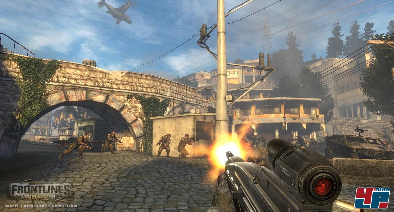 Genau wie in den Mehrspielerpartien besteht eure Aufgabe auch in der Kampagne meist darin, bestimmte Punkte auf der Karte einzunehmen. Dabei müsst ihr entweder nur lange genug an einer Position verweilen, kurz einen Computer bedienen oder Objekte wie Satellitenschüsseln in die Luft sprengen. Viele Varianten gibt es nicht, doch zumindest habt ihr oft die Wahl, in welcher Reihenfolge ihr die Terrain-Eroberung in Angriff nehmen wollt. Habt ihr die Stellungen eingenommen, bleiben sie normalerweise unter eurer Kontrolle, so dass ihr euch keine Sorgen um eine Rückeroberung der KI machen müsst. Nur einmal setzen eure Feinde im Laufe der Kampagne alles daran, ein bereits gesichertes Gebäude wieder einzunehmen. Doch eigentlich beschränkt sich eure Aufgabe im Großen und Ganzen darauf, in den weitläufigen Arealen alles zu eliminieren, was euch vor die Flinte läuft. Einfaches Spiel habt ihr dabei mit den Fußsoldaten, die nicht gerade mit viel Intelligenz gesegnet sind und z.B. einfach auf euch zu oder sogar an euch vorbeirennen ohne auf eure Präsenz zu reagieren. Auf der anderen Seite suchen sie aber auch oft Deckung und wechseln ihre Positionen, wobei beides nach kurzer Zeit sehr vorhersehbar wird. Insgesamt darf man die Rotstern-Truppen aber nicht unterschätzen, denn trotz manch fragwürdiger KI-Aussetzer sind sie zumindest eines: treffsicher! Da zischen euch Bazooka-Geschosse im Panzer entgegen, Scharfschützen nehmen hinterhältig aus überlegenen Positionen euren Kopf ins Visier und die Infanterie klemmt sich hinter das MG-Geschütz, um euch mit saftigen Gewehrsalven einzudecken. Vor allem wenn ihr gleich mehreren Feinden gegenübersteht – und das ist meistens der Fall – können die Feuergefechte zu einer echten Herausforderung werden. Noch heftiger geht es zur Sache, wenn ihr auch noch mit feindlichen Vehikeln konfrontiert werdet. Nicht nur ihr dürft hinter dem Steuer eines Panzers, Hubschraubers oder Jeeps Platz nehmen, sondern auch die Rotstern-Allianz fährt oft schwere Geschütze auf, um euch das Leben schwer zu machen. Hier hilft oft nur der Kampf Panzer gegen Panzer oder mehrere Treffer mit der Bazooka. Außerdem stehen euch auch KI-Kameraden zur Seite, über die ihr zwar keine direkte Befehlsgewalt habt, aber die sich meist aktiv und nützlich am Kampfgeschehen beteiligen. Nur ab und zu gibt es auch hier blöde Aussetzer, in denen ihr euch von eurer Unterstützung im Stich gelassen fühlt, wenn sie lieber auf weit entfernte Gegner ballert anstatt sich um die unmittelbare Bedrohung vor ihrer Nase zu kümmern, die euch gerade das Leben schwer macht. Während ihr euch mit einem regenerativen Heilsystem fit haltet oder bei vorzeitigem Tod eines der beschränkten Leben verschwendet, braucht ihr euch um die Gesundheit eurer Mitstreiter keine Sorgen zu machen. Re-Animationen im Stil von GRAW fallen hier also flach – genau wie ein Deckungssystem. Ihr könnt lediglich in die Hocke gehen oder euch flach auf den Boden legen sowie Schutz hinter Wänden und anderen Stellen suchen – vorsichtig um die Ecke schielen oder aus einer Deckung hervorschnellen dagegen nicht. Eine gute Alternative zur klassischen Deckung besteht bei Frontlines allerdings darin, mit Hilfe der Sprint-Taste dem Kugelhagel zu entkommen.